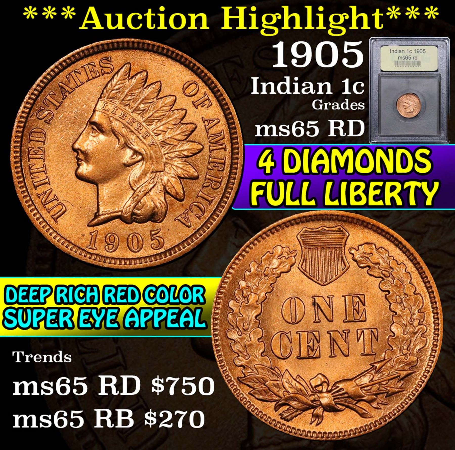 ***Auction Highlight*** 1905 Indian Cent 1c Graded GEM Unc RD By USCG. A Corey's Pick