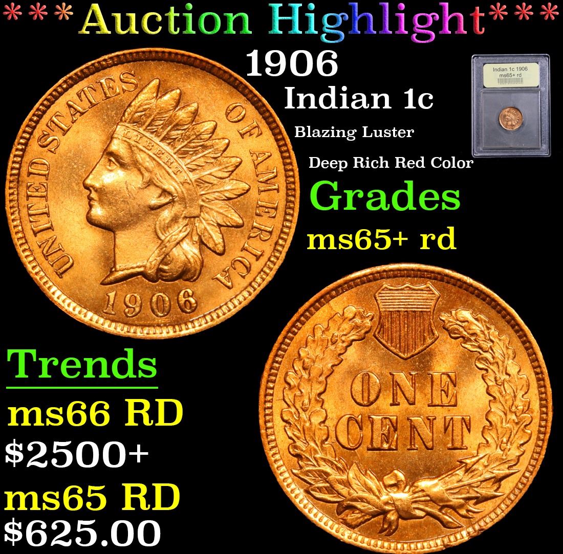 ***Auction Highlight*** 1906 Blazing Luster Deep Rich Red Color Indian Cent 1c Graded Gem+ Unc RD By USCG. A Corey's Pick, Bid to Win, Don't let it get Away, you might not find its equal Coin