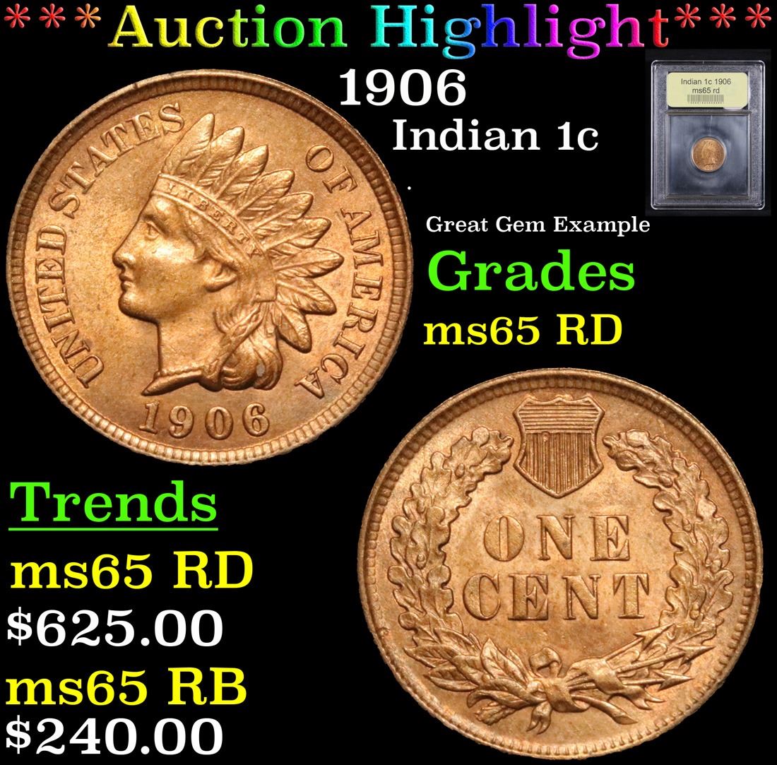***Auction Highlight*** 1906 . Great Gem Example Indian Cent 1c Graded Gem++ Unc rd By USCG.