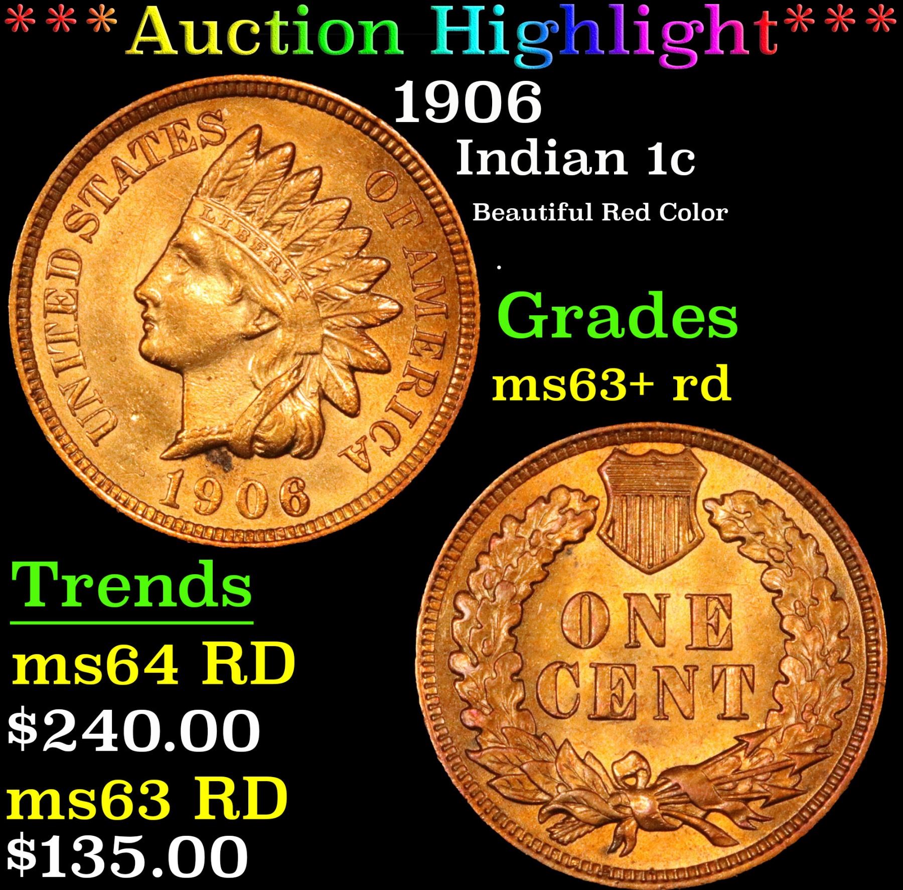 ***Auction Highlight*** 1906 Indian Cent 1c Graded Select+ Unc RD By USCG. Beautiful red color A Corey's Pick, Bid to Win, Don't let it get Away Coin