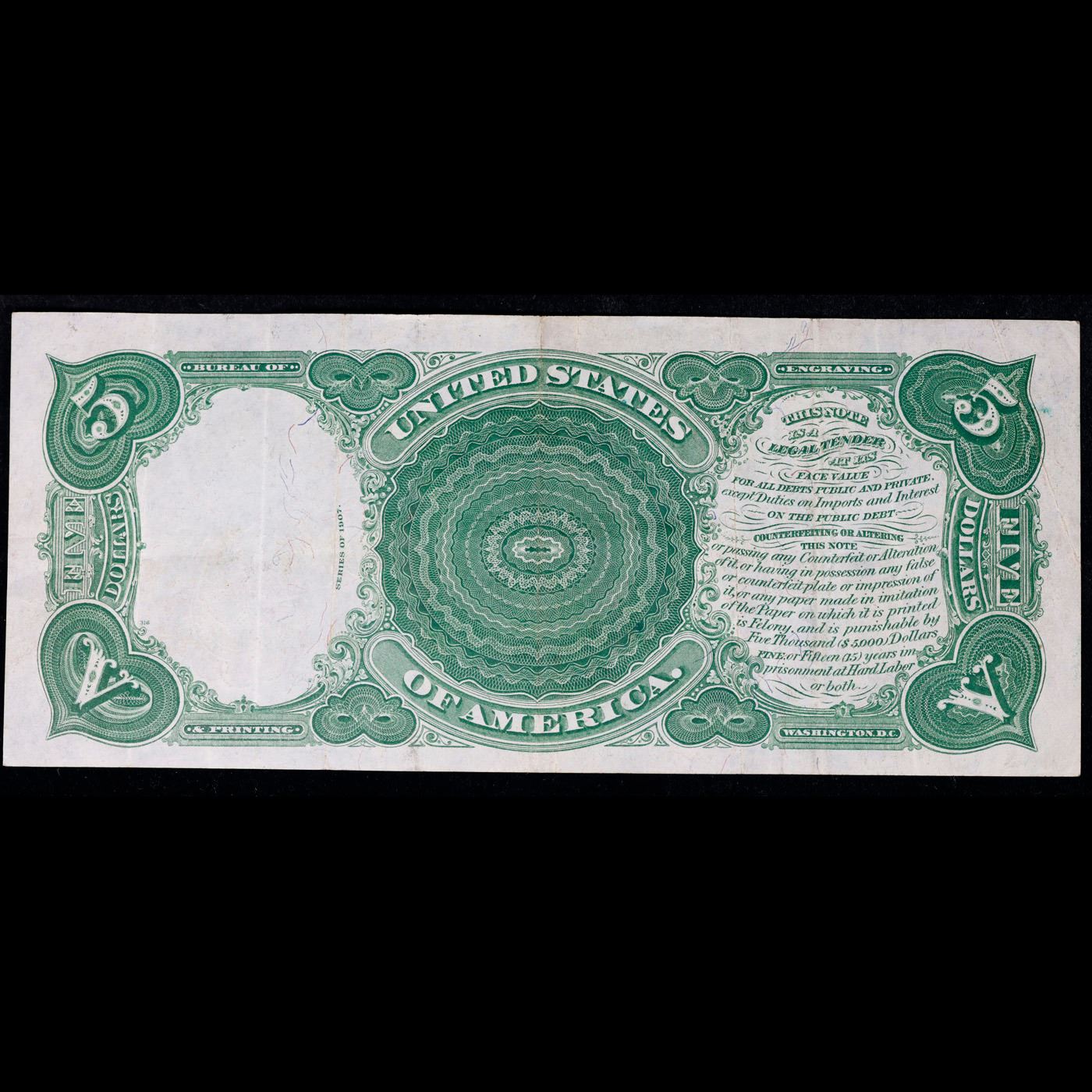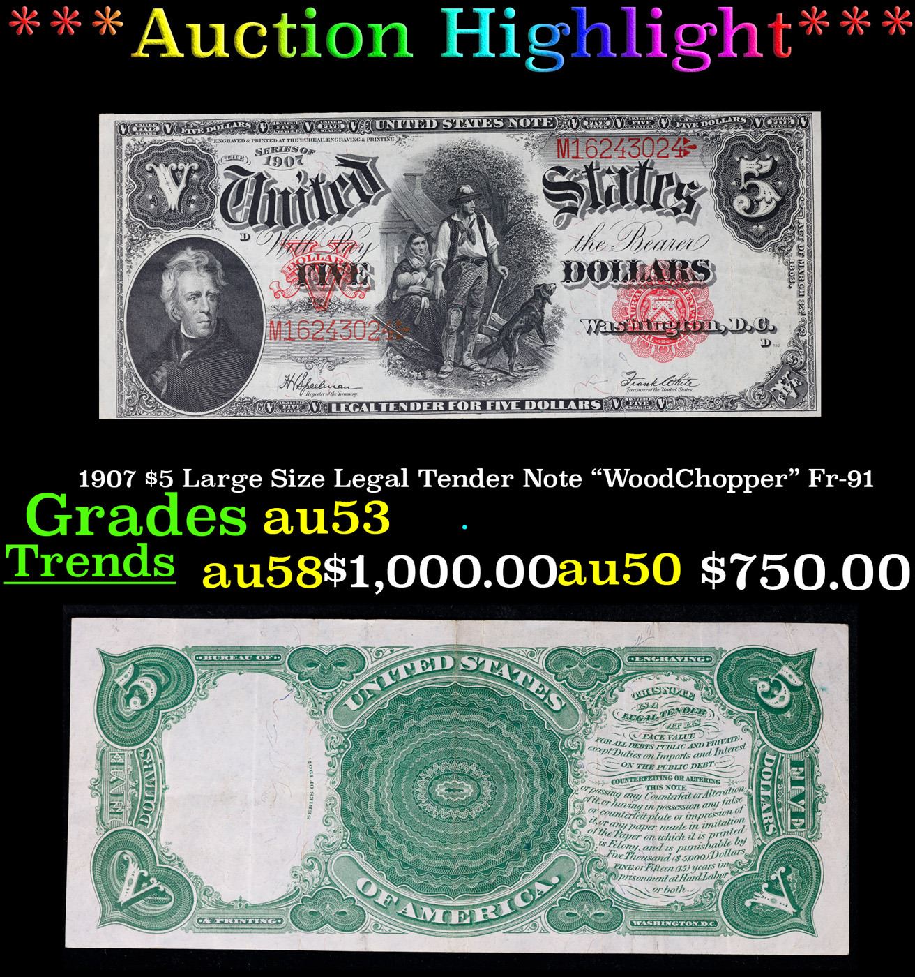 ***Auction Highlight*** 1907 $5 Large Size Legal Tender Note "WoodChopper" Fr-91 Grades Select AU (f