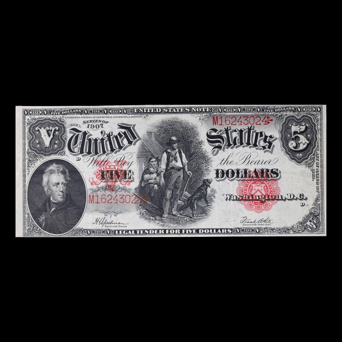 ***Auction Highlight*** 1907 $5 Large Size Legal Tender Note "WoodChopper" Fr-91 Grades Select AU. It is one of the most sought-after notes ever produced and now you can claim one for yourself! Nicknamed the "Woodchopper," the Series of 1907 $5 legal tender bill represents the last of the large size (or "horse-blanket" size) notes every issued in the United States. Bold red color defines the front of the coveted "Woodchopper" bill, across a Roman numeral "V," the treasury seal and the serial number. Then, what gives this $5 red treasury seal bill its namesake is a central portrait of a man with an axe, his dog, wife and child. The front also features a portrait of Andrew Jackson, which would later grace the $20 bill. Then, on the reverse side of this Andrew Jackson $5 bill is a central image design flanked by two ovals Fr# 91 SIgnatues Speelman-White A Key Date's Pick, Bid to Win Coin