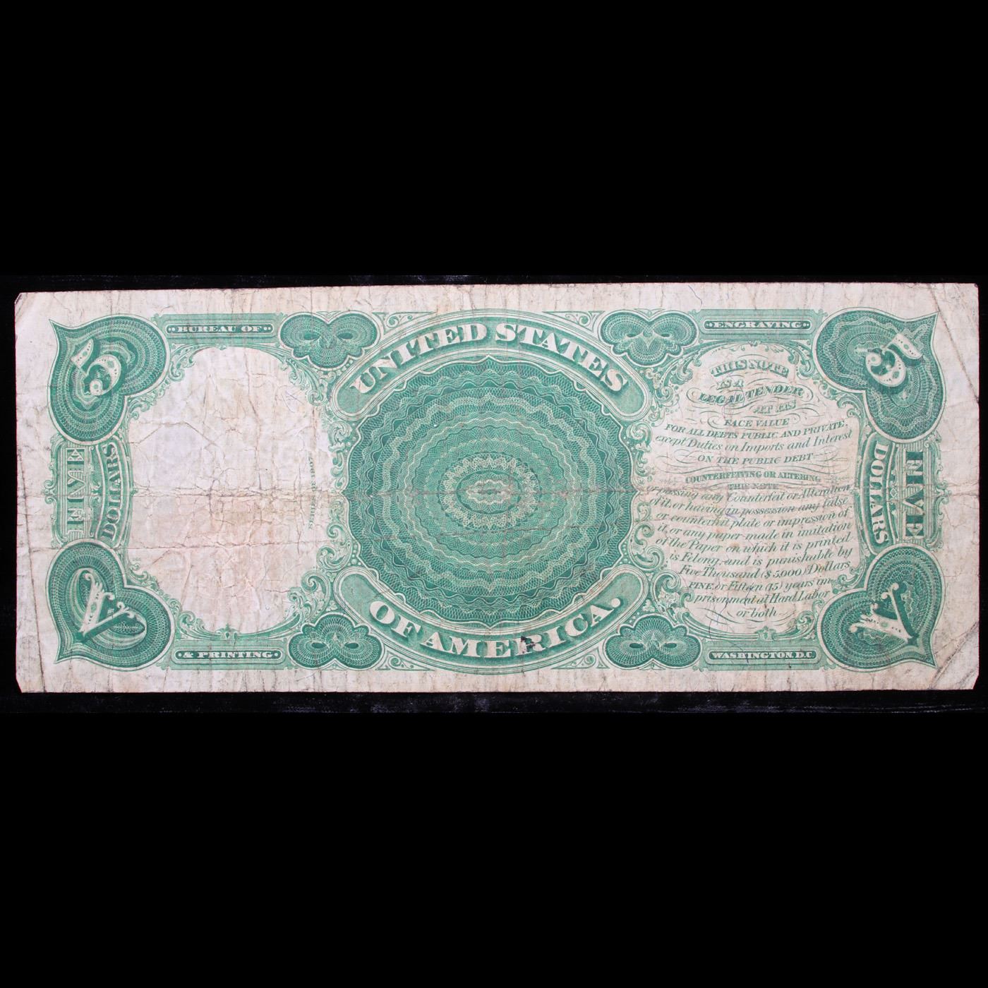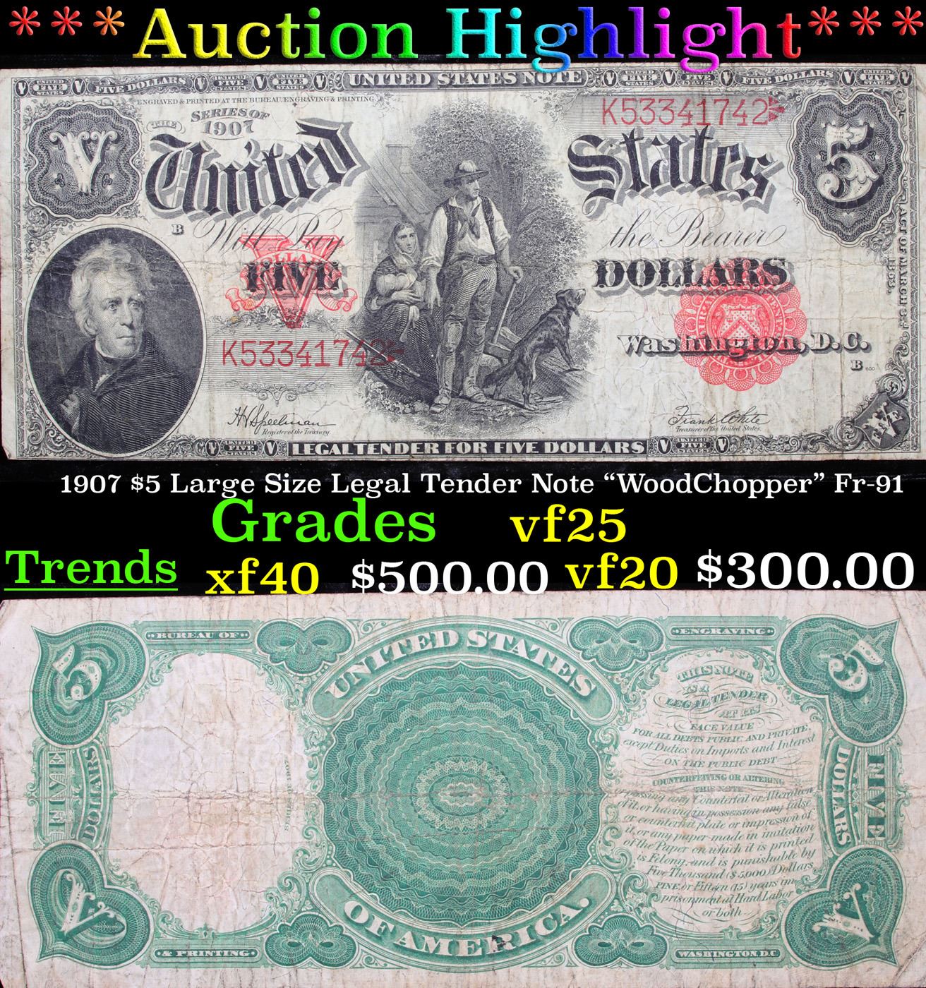 ***Auction Highlight*** 1907 $5 Large Size Legal Tender Note "WoodChopper" Fr-91 Grades vf+ (fc)