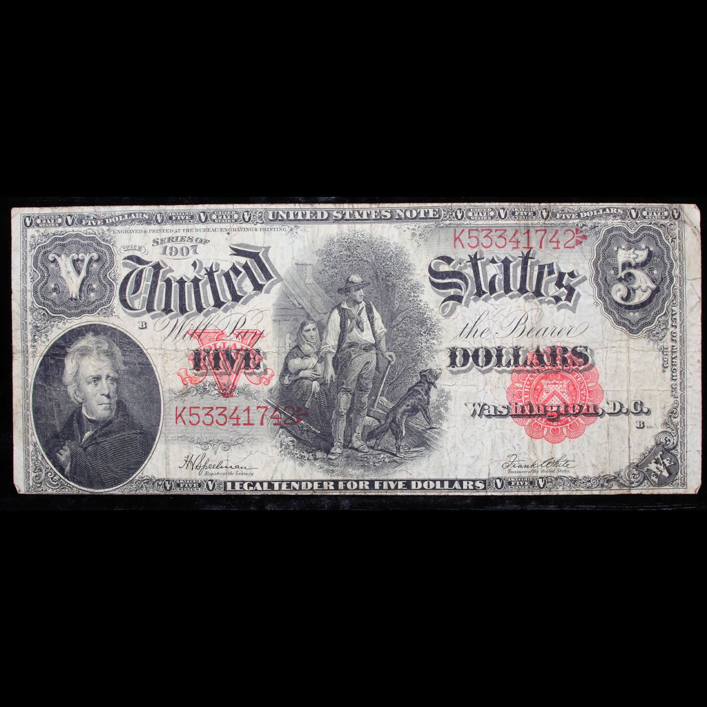 ***Auction Highlight*** 1907 $5 Large Size Legal Tender Note "WoodChopper" Fr-91 Grades vf+. It is one of the most sought-after notes ever produced and now you can claim one for yourself! Nicknamed the "Woodchopper," the Series of 1907 $5 legal tender bill represents the last of the large size (or "horse-blanket" size) notes every issued in the United States. Bold red color defines the front of the coveted "Woodchopper" bill, across a Roman numeral "V," the treasury seal and the serial number. Then, what gives this $5 red treasury seal bill its namesake is a central portrait of a man with an axe, his dog, wife and child. The front also features a portrait of Andrew Jackson, which would later grace the $20 bill. Then, on the reverse side of this Andrew Jackson $5 bill is a central image design flanked by two ovals Fr# 91 SIgnatues Speelman-White