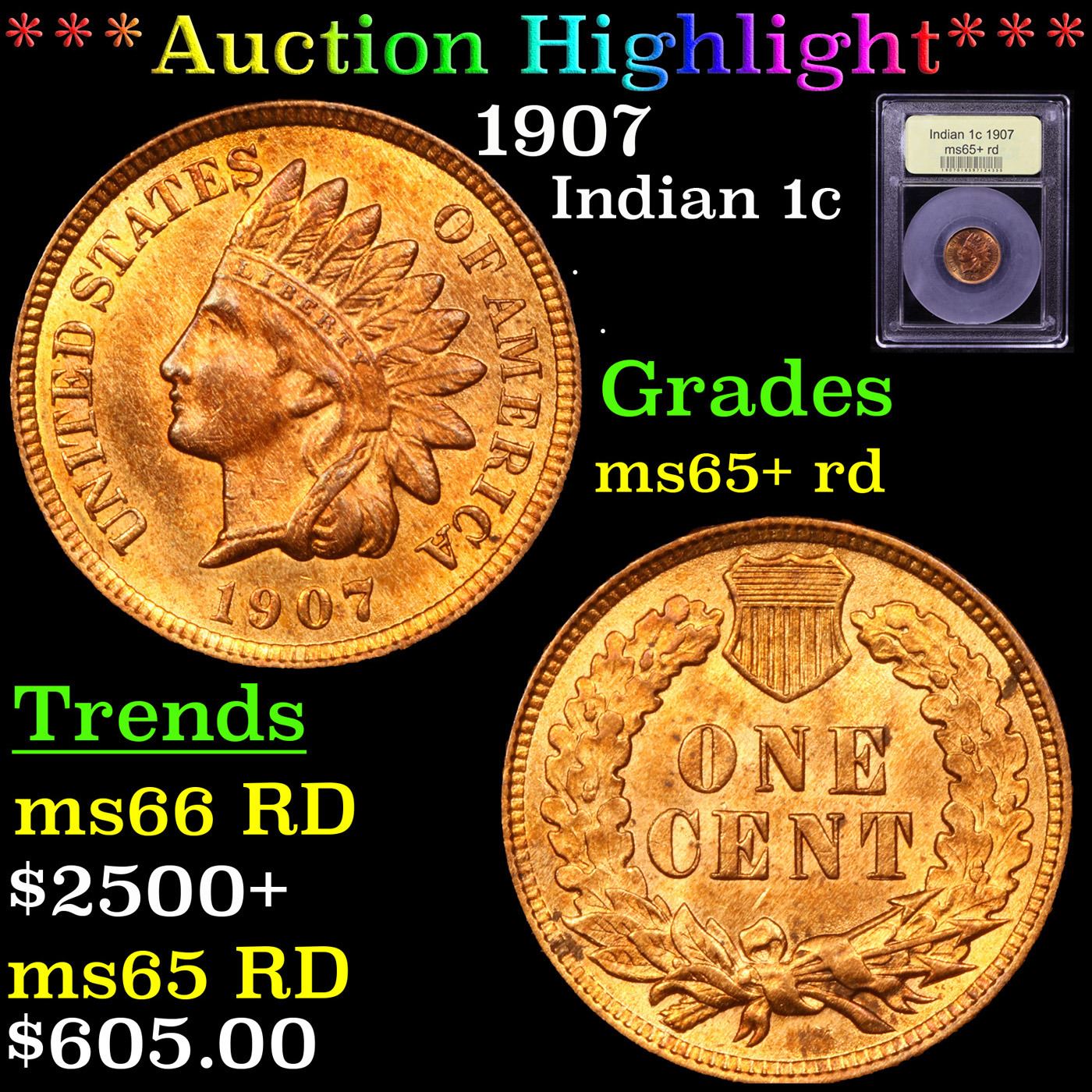***Auction Highlight*** 1907 Indian Cent 1c Graded Gem+ Unc RD By USCG.