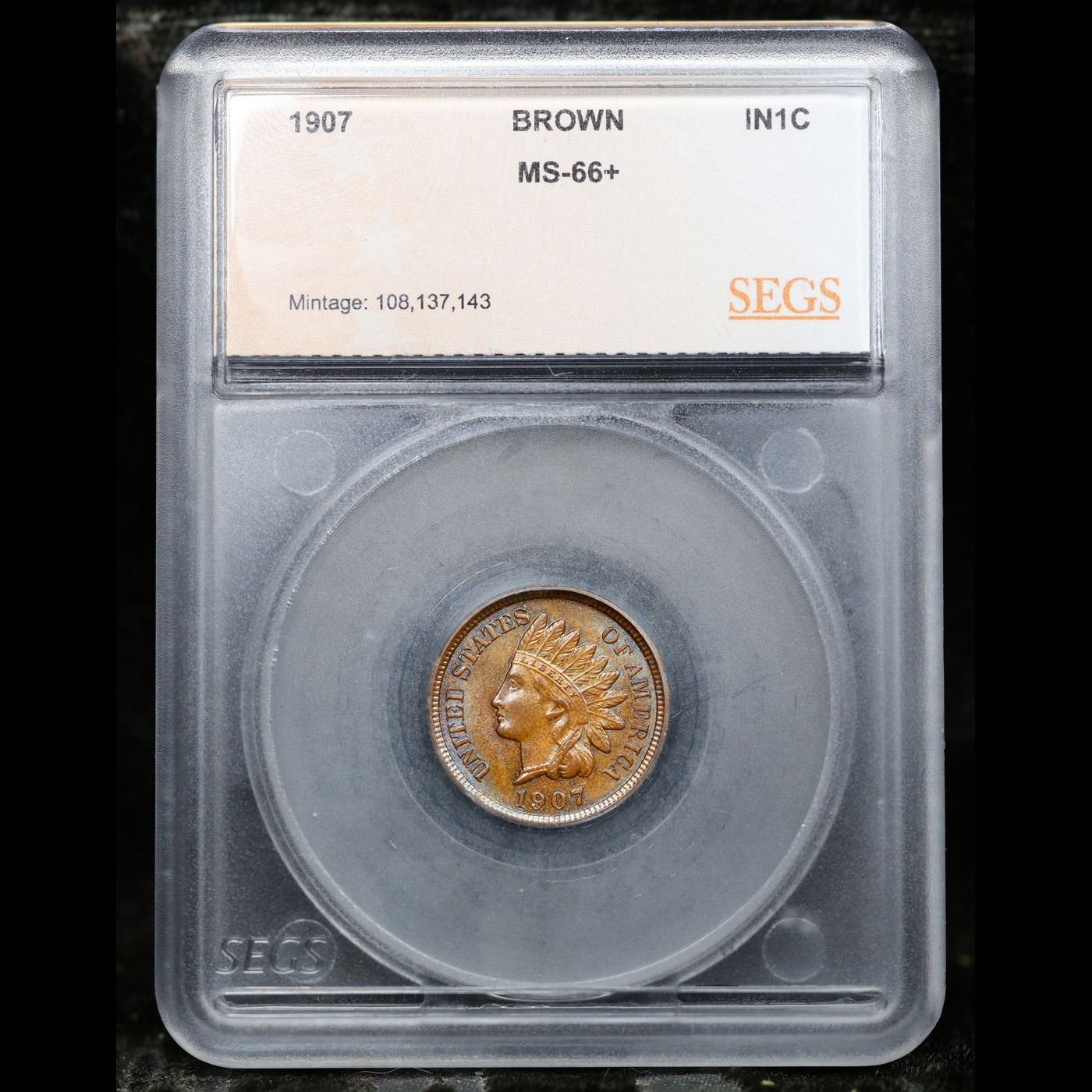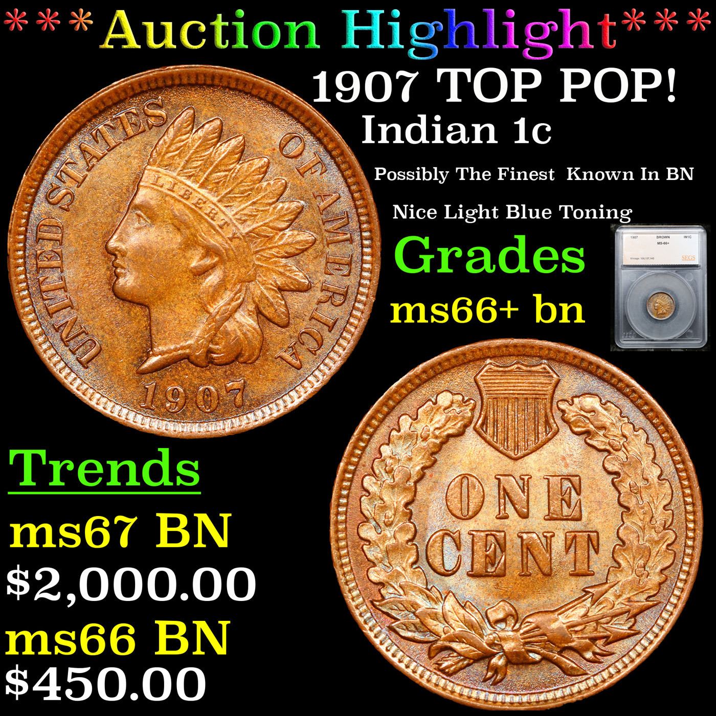 ***Auction Highlight*** 1907 TOP POP! Indian Cent 1c Graded ms66+ bn By SEGS. A Corey's Pick, Bid to Win, Don't let it get Away Coin