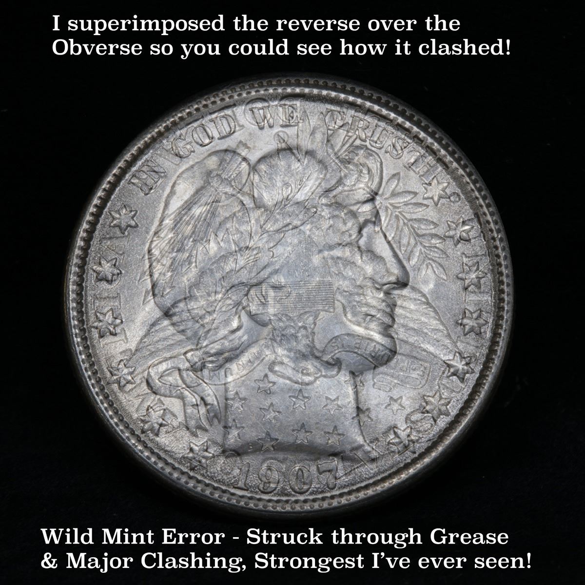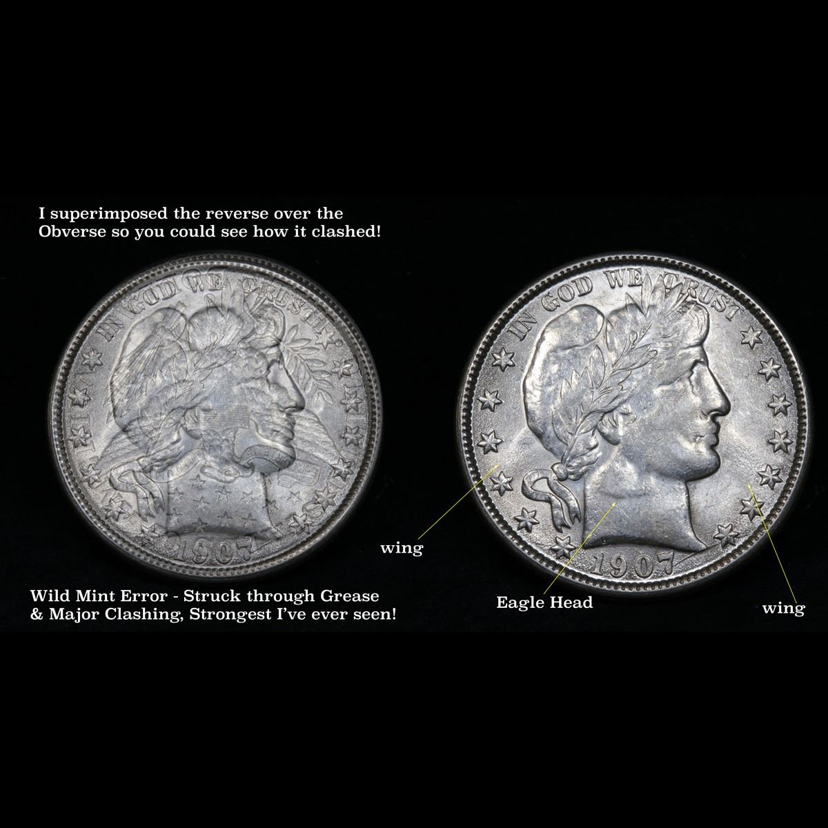 ***Auction Highlight*** 1907-o Mint Error Barber Half Dollars 50c Graded Choice Unc By USCG. Up for auction is an Incredible Multple Mint Error 1907-o Barber Half Dollar. I has some of he strongest clashing I�ve ever seen and it was also struck through grease, and has a convex obverse. I showed you two extra photos to explain the wild clashing. You can see clearly the eagles head on the neckline of the obverse and both wings. Reall incredible coin, and it also has a strong die brea on the Lower obverse at 5:00. It was obviously struck with an incredibly worn obverse die. A Corey's Pick, Bid to Win, Don't let it get Away, you might not find its equal Coin. I give this coin my highest recommendation