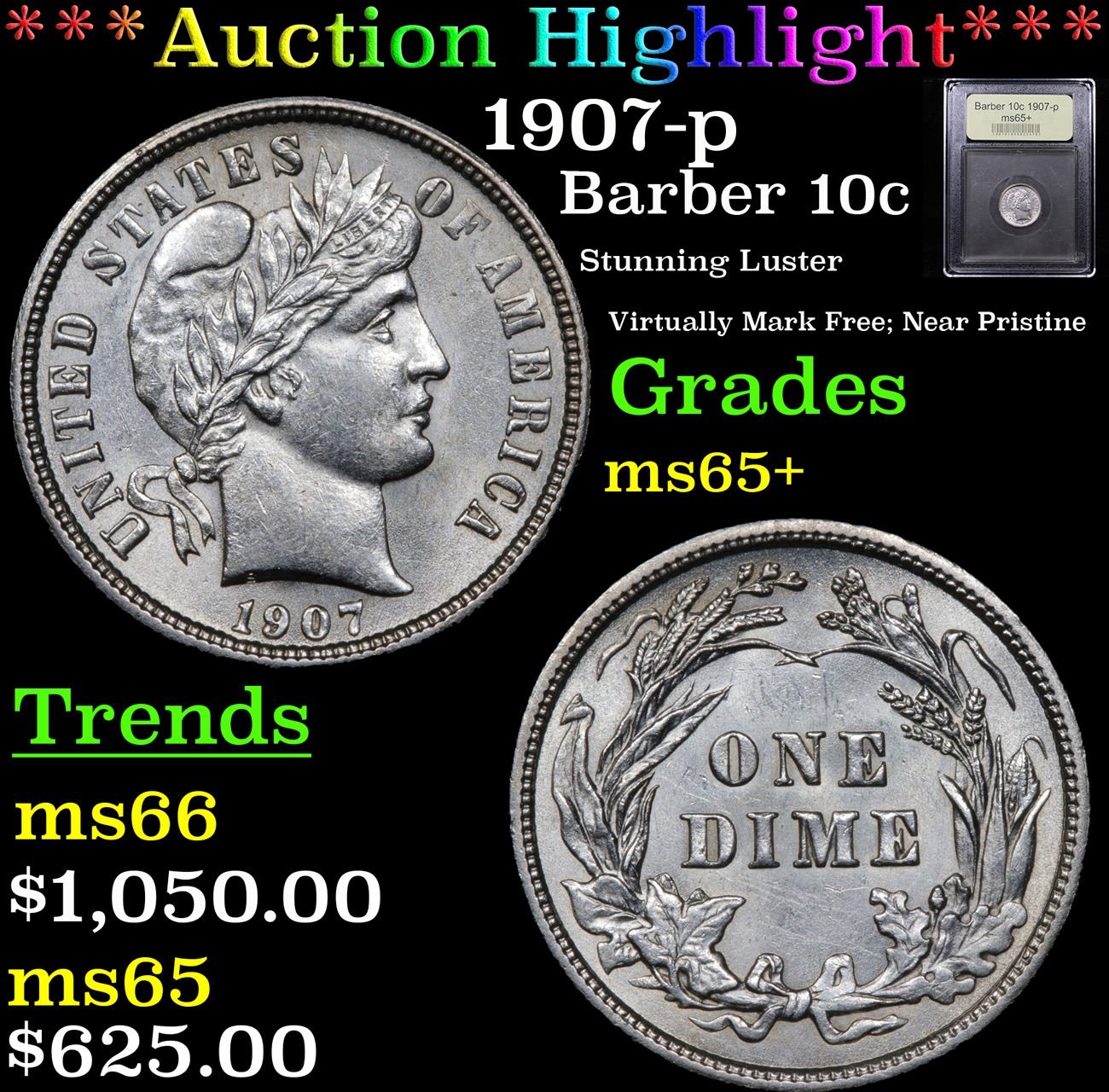 ***Auction Highlight*** 1907-p Stunning Luster Virtually Mark Free; Near Pristine Barber Dime 10c Graded GEM+ Unc By USCG. A Corey's Pick, Bid to Win, Don't let it get Away Coin