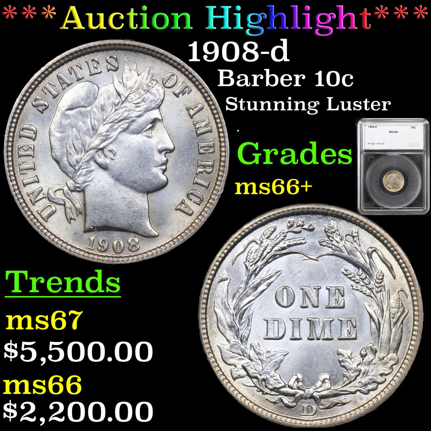 ***Auction Highlight*** 1908-d Barber Dime 10c Graded ms66+ By SEGS.
