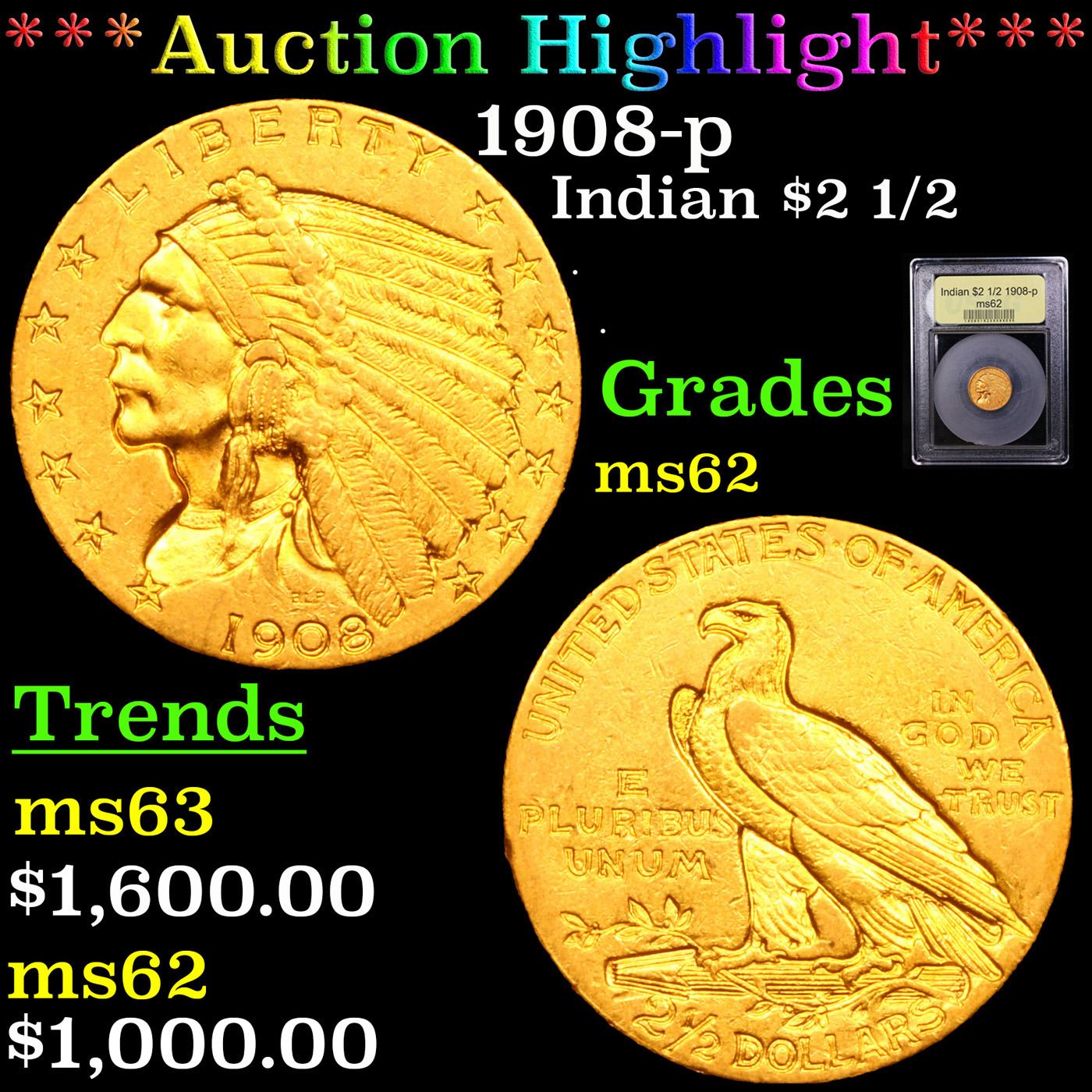 ***Auction Highlight*** 1908-p Gold Indian Quarter Eagle $2 1/2 Graded Select Unc BY USCG.