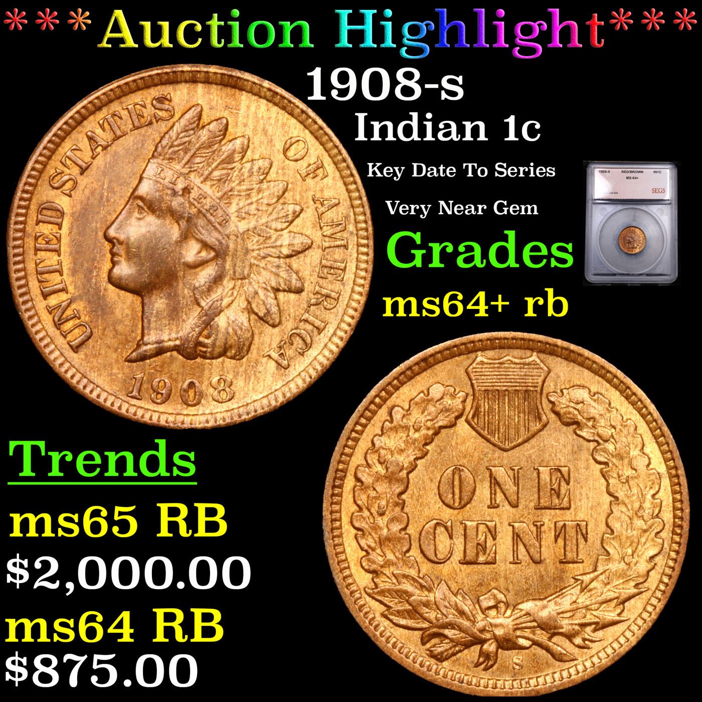 ***Auction Highlight*** 1908-s Indian Cent 1c Grades Choice+ Unc RB By SEGS. very scarce. Per PCGS :"The 1908-S Indian cent is the third lowest mintage circulation strike Indian cent. The only two other lower mintage coins in the series are the 1877 and the 1909-S, with the latter being the lowest mintage in the entire series." also PCGS estimates only 3000 survive in all grades A Corey's Pick, Bid to Win Coin