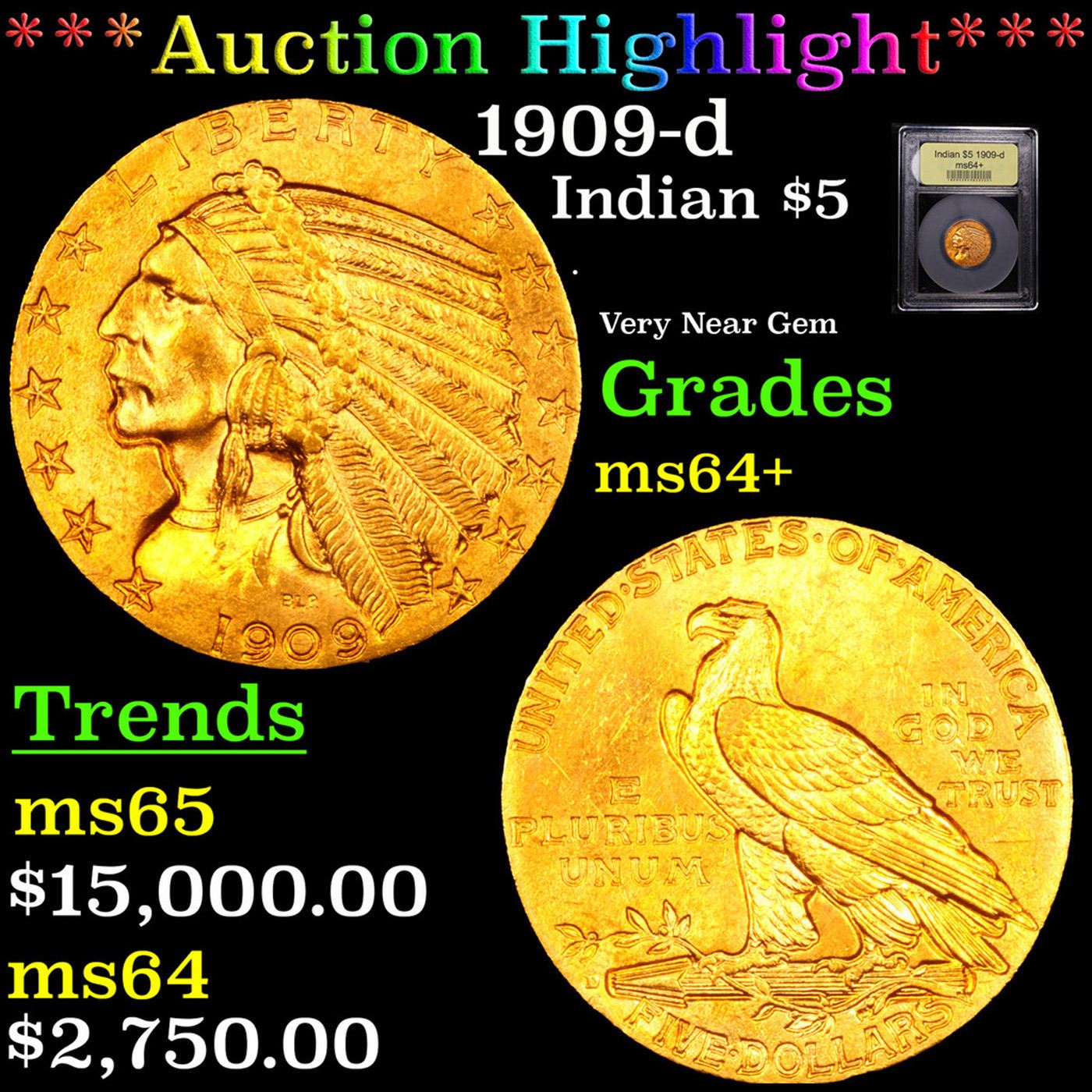 ***Auction Highlight*** 1909-d Gold Indian Half Eagle $5 Graded Choice+ Unc BY USCG. A Corey's Pick, Bid to Win, Don't let it get Away Coin