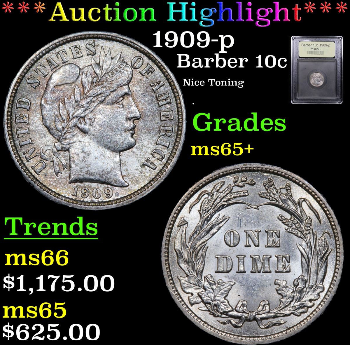 ***Auction Highlight*** 1909-p Nice Toning . Barber Dime 10c Graded GEM+ Unc By USCG. A Corey's Pick, Bid to Win Coin