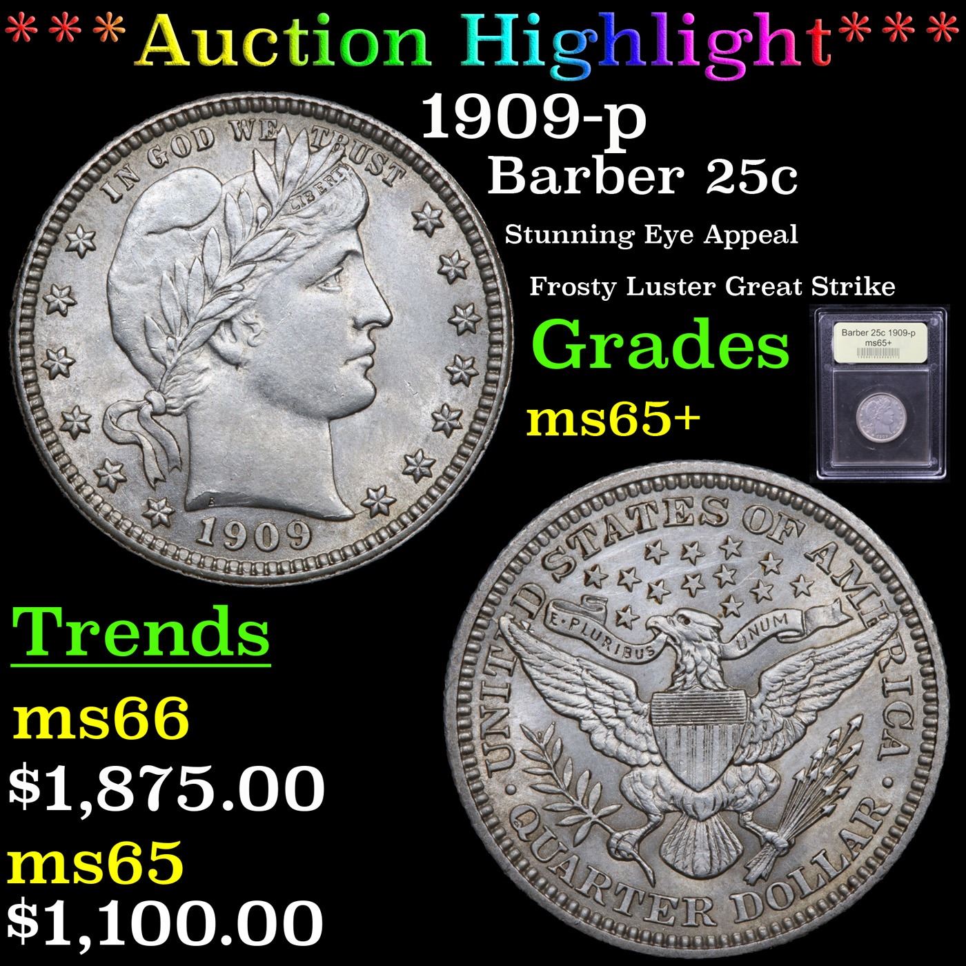 ***Auction Highlight*** 1909-p Barber Quarter 25c Graded GEM+ Unc BY USCG. This is an outstanding, high end MS-62 to represent the conditionally challenging 1886-O silver dollar. Sharply struck with fulsome mint luster, both sides also possess a brilliant silver white appearance. Illustrative of one of the situations that make the Morgan dollar series so appealing to numismatists, this issue is far scarcer in Mint State than the 1883-O, 1884-O and 1885-O despite having a higher mintage (10,710,000 coins for the 1886-O as opposed to, for example, 9,185,000 pieces for the 1885-O). Given that the 1886-O is plentiful in worn condition, millions of examples likely found their way into circulation beginning in the late 19th century. Millions more, probably more than half of the mintage, were almost certainly kept in storage until melted under the terms of the 1918 Pittman Act. Today the conditionally challenging nature of this New Orleans Mint issue is well known, as is the prevalence of poorly struck coins among the relatively few Uncirculated survivors. Exceptionally well produced and preserved, the premium quality example offered here is sure to see spirited bidding.