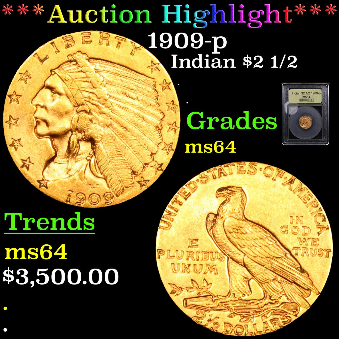***Auction Highlight*** 1909-p Gold Indian Quarter Eagle $2 1/2 Graded Choice Unc By USCG.
