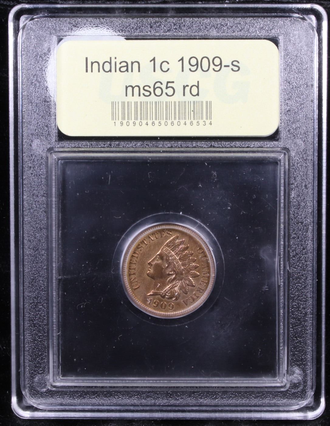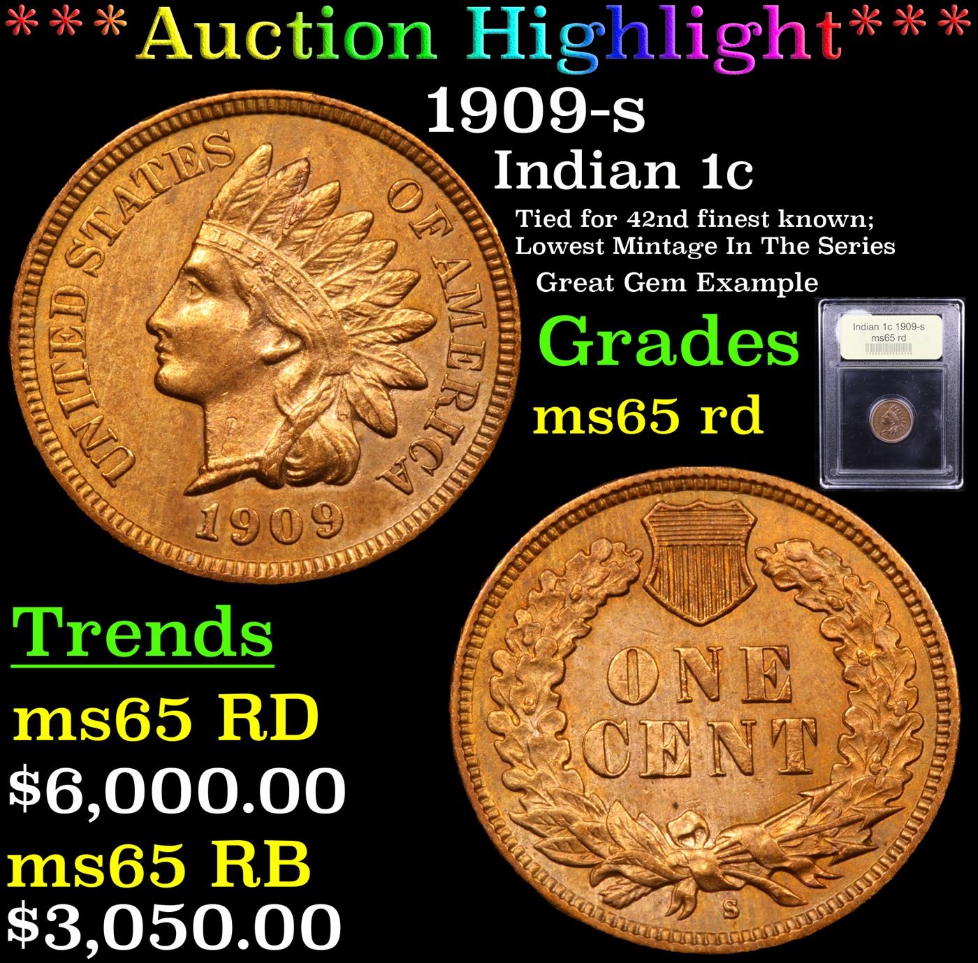 ***Auction Highlight*** 1909-s Indian Cent 1c Graded GEM Unc RD By USCG. The 1909-S boasts the lowest mintage in the Indian cent series, even lower than the key-date 1877 (309,000 vs 852,500 pieces). Red Uncirculated examples are often available, but such coins are elusive in Gem and finer condition. This piece displays frosty copper-orange luster and has few abrasions. Only trivial signs of carbon are evident beneath a loupe. The strike is above average for the issue, particularly on the headdress feathers, which are well-defined A Corey's Pick, Bid to Win, Don't let it get Away, you might not find its equal Coin. I give this coin my highest recommendation