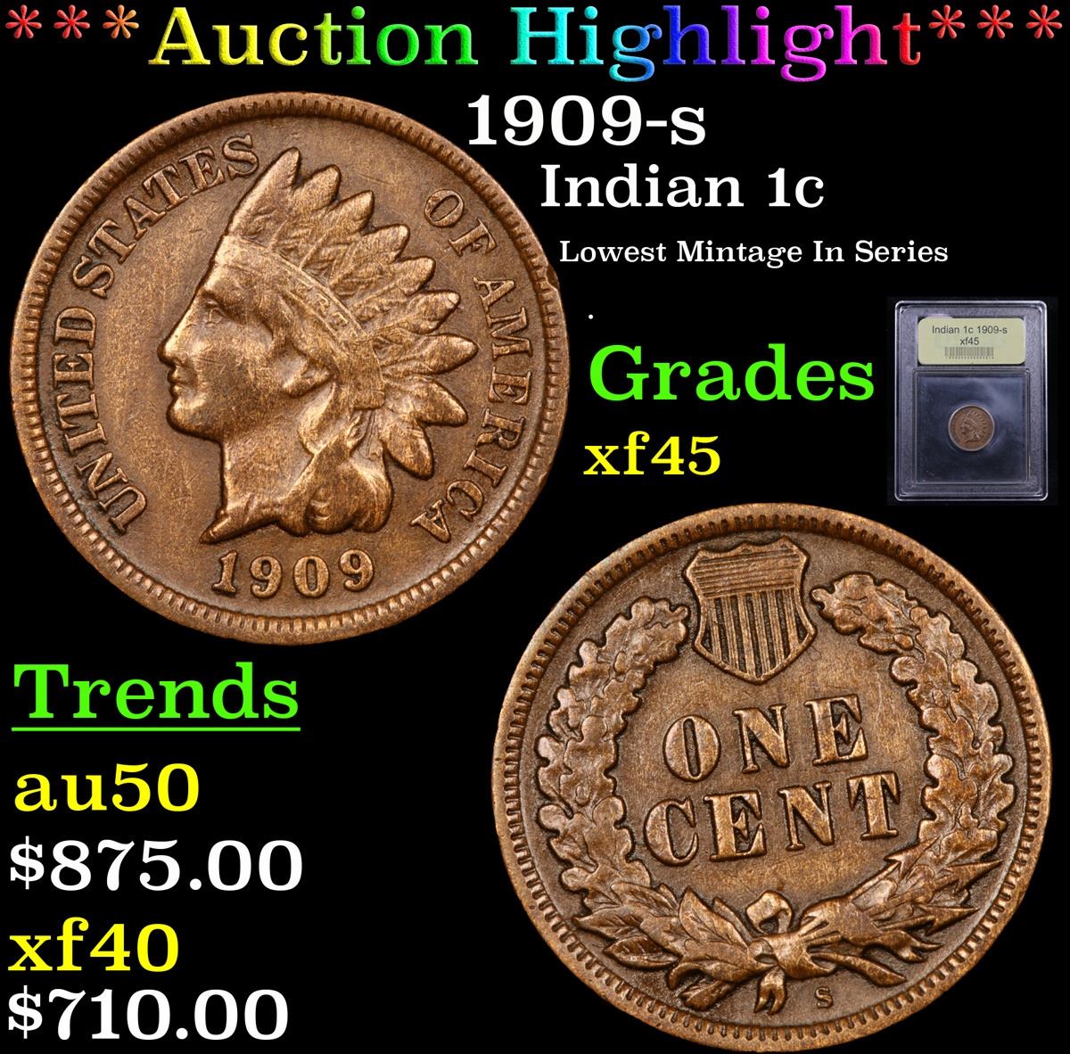 ***Auction Highlight*** 1909-s Indian Cent 1c Graded xf+ By USCG. 0
