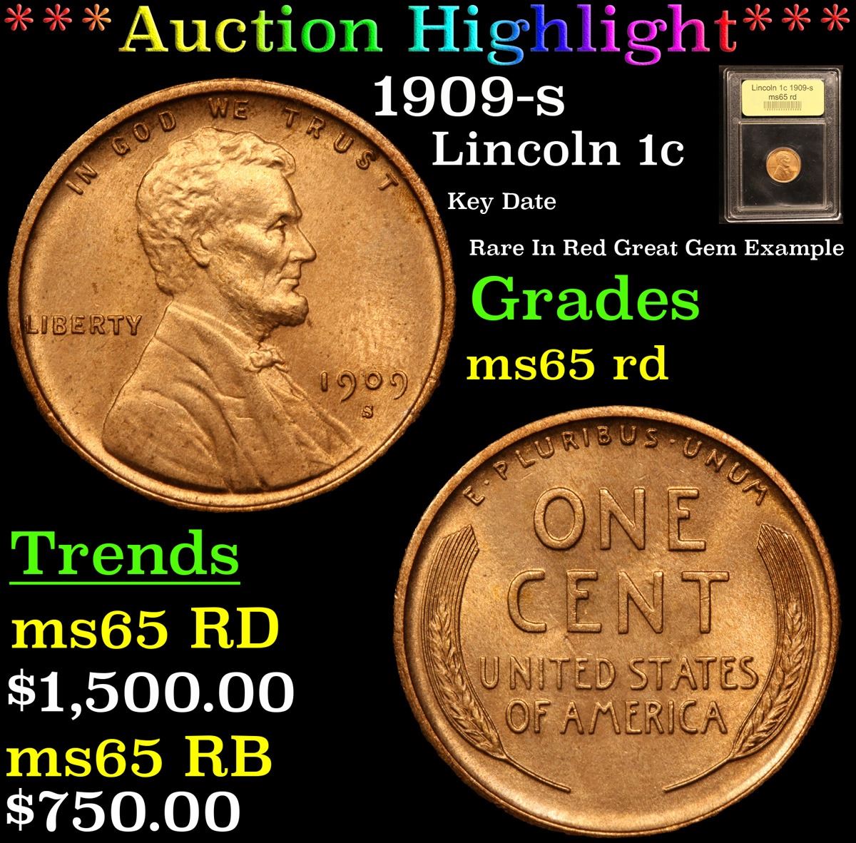 ***Auction Highlight*** 1909-s Lincoln Cent 1c Graded GEM Unc RD By USCG. A Corey's Pick, Bid to Win, Don't let it get Away Coin