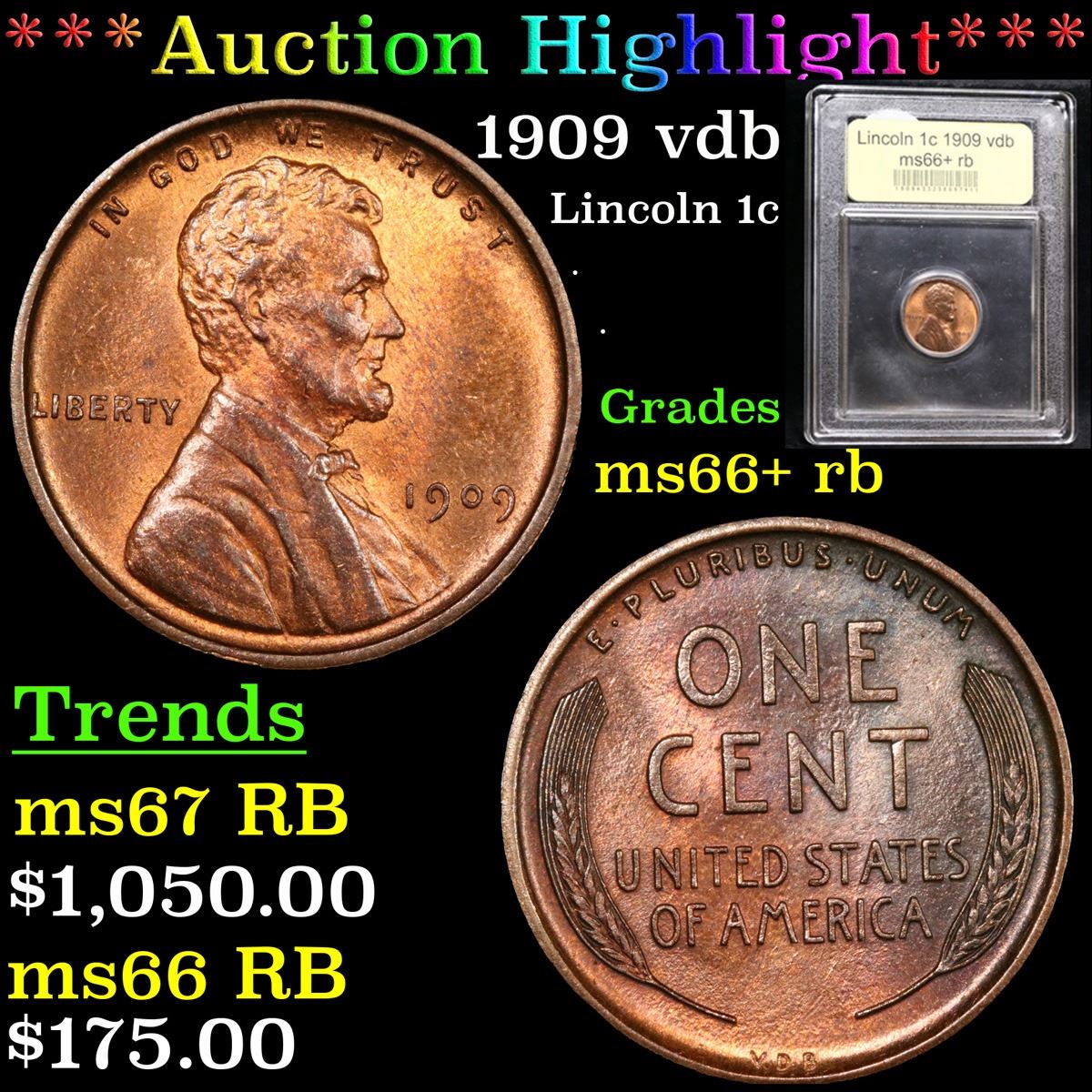 ***Auction Highlight*** 1909 vdb . . Lincoln Cent 1c Graded GEM++ RB By USCG. Always sought after date. Always popular. A Corey's Pick, Bid to Win Coin