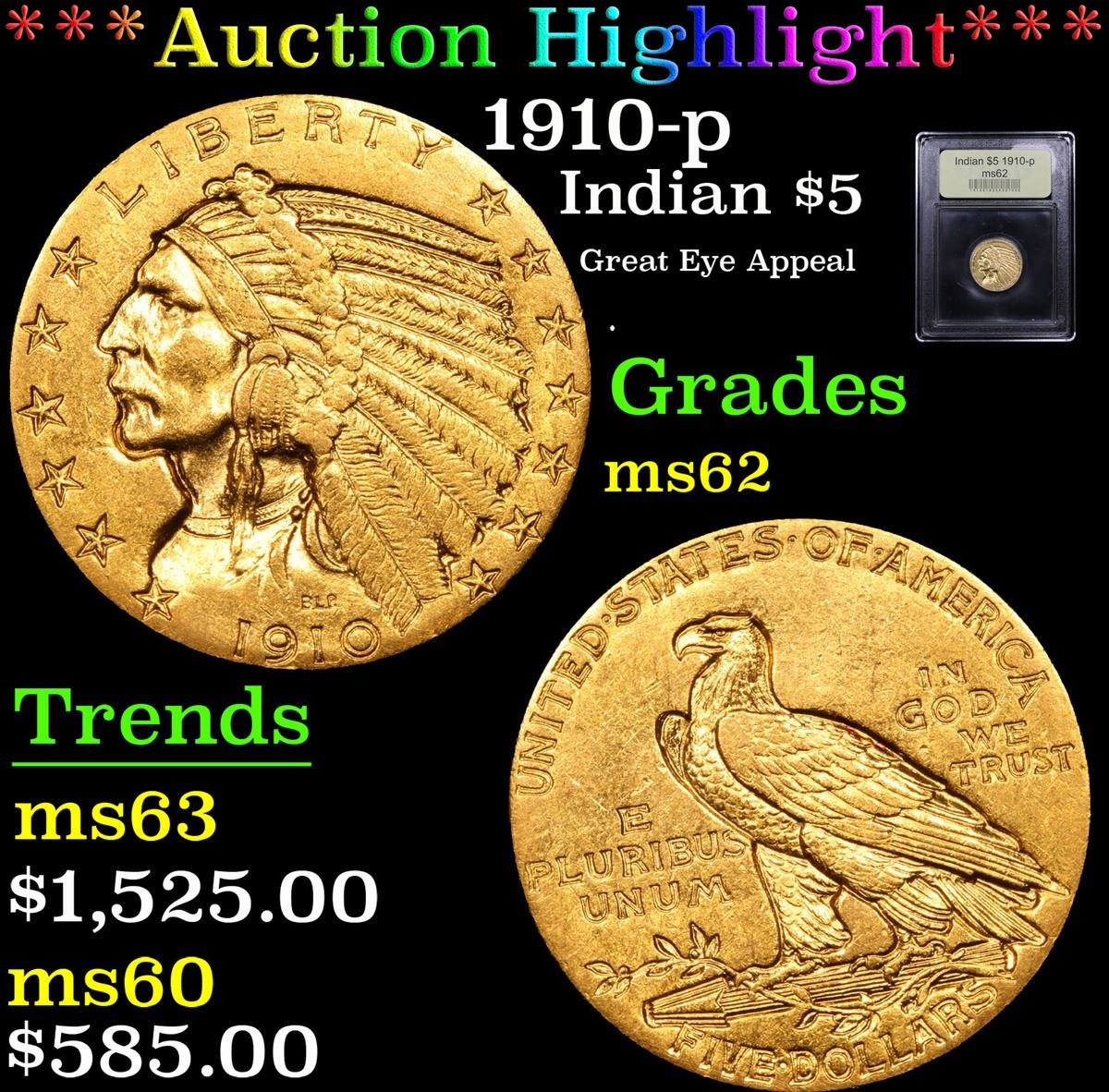 ***Auction Highlight*** 1910-p Great Eye Appeal . Gold Indian Half Eagle $5 Graded Select Unc By USCG.