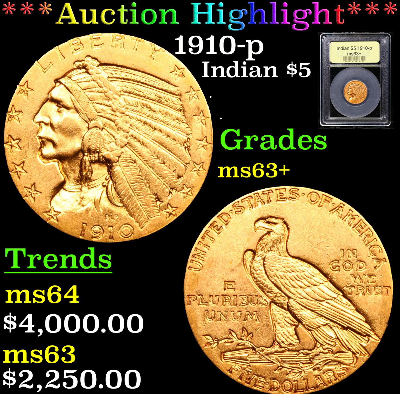 ***Auction Highlight*** 1910-p Gold Indian Half Eagle $5 Graded Select+ Unc By USCG.