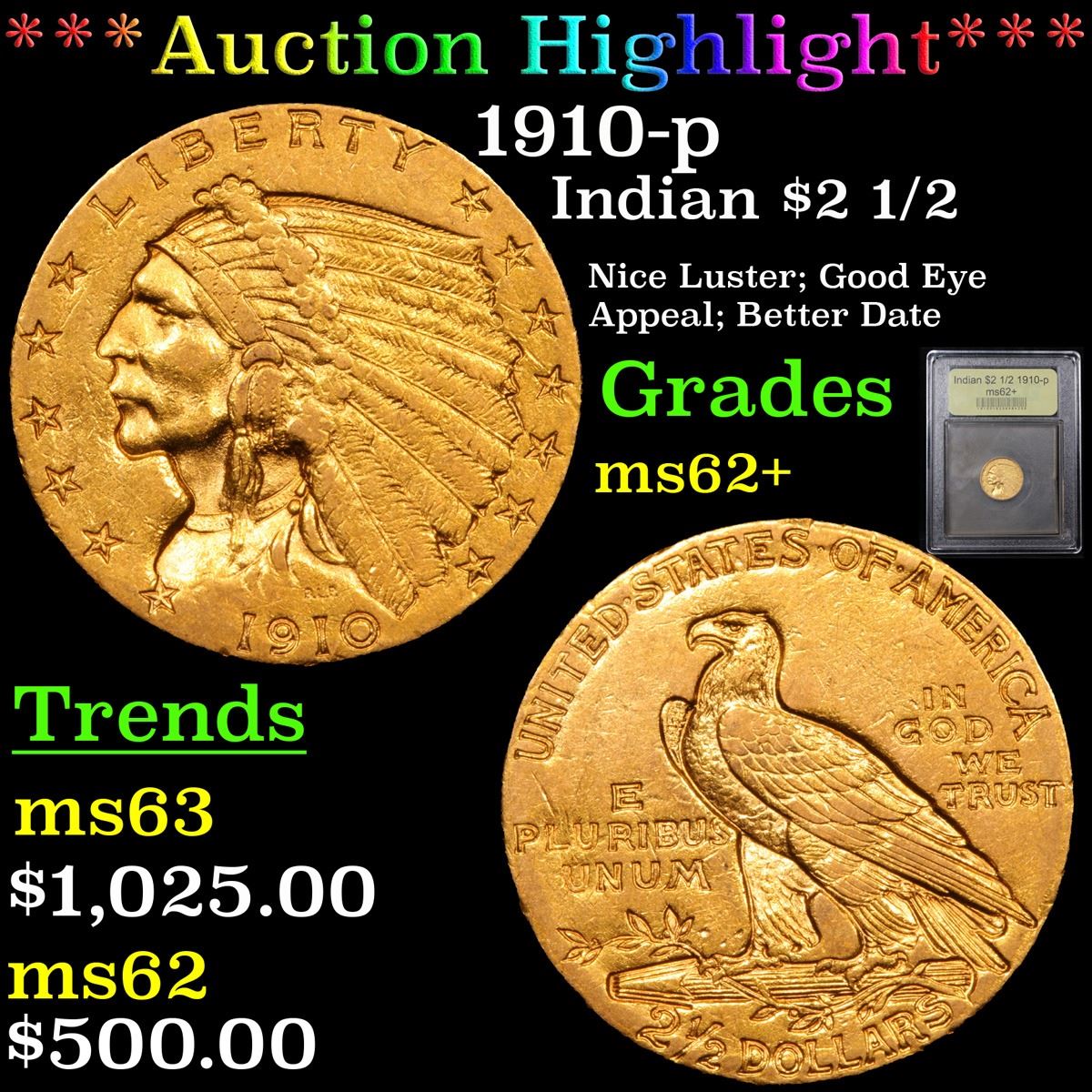 ***Auction Highlight*** 1910-p Gold Indian Quarter Eagle $2 1/2 Graded Select Unc By USCG. A Corey's Pick, Bid to Win Coin