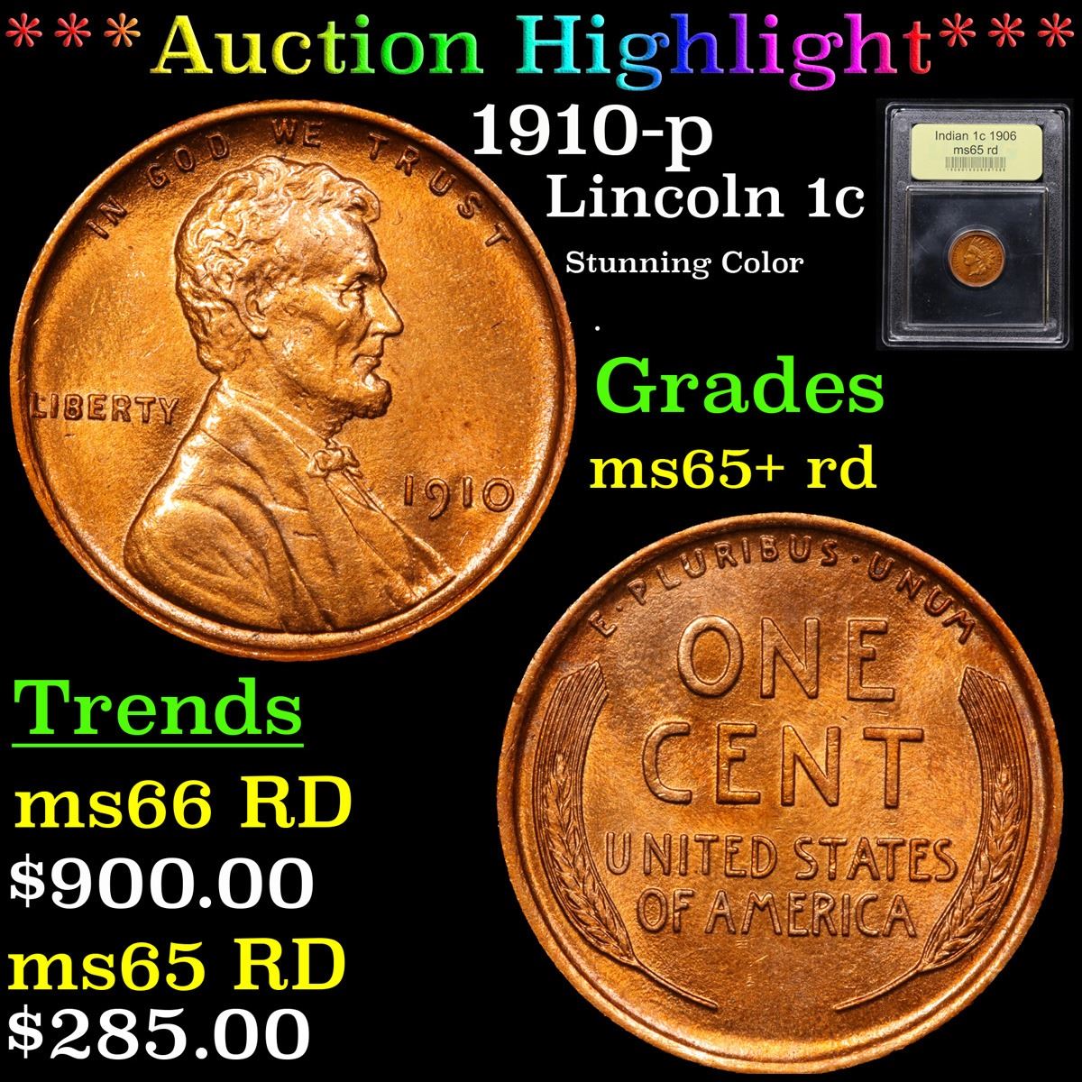 ***Auction Highlight*** 1910-p Stunning Color . Lincoln Cent 1c Graded Gem+ Unc RD By USCG. 0