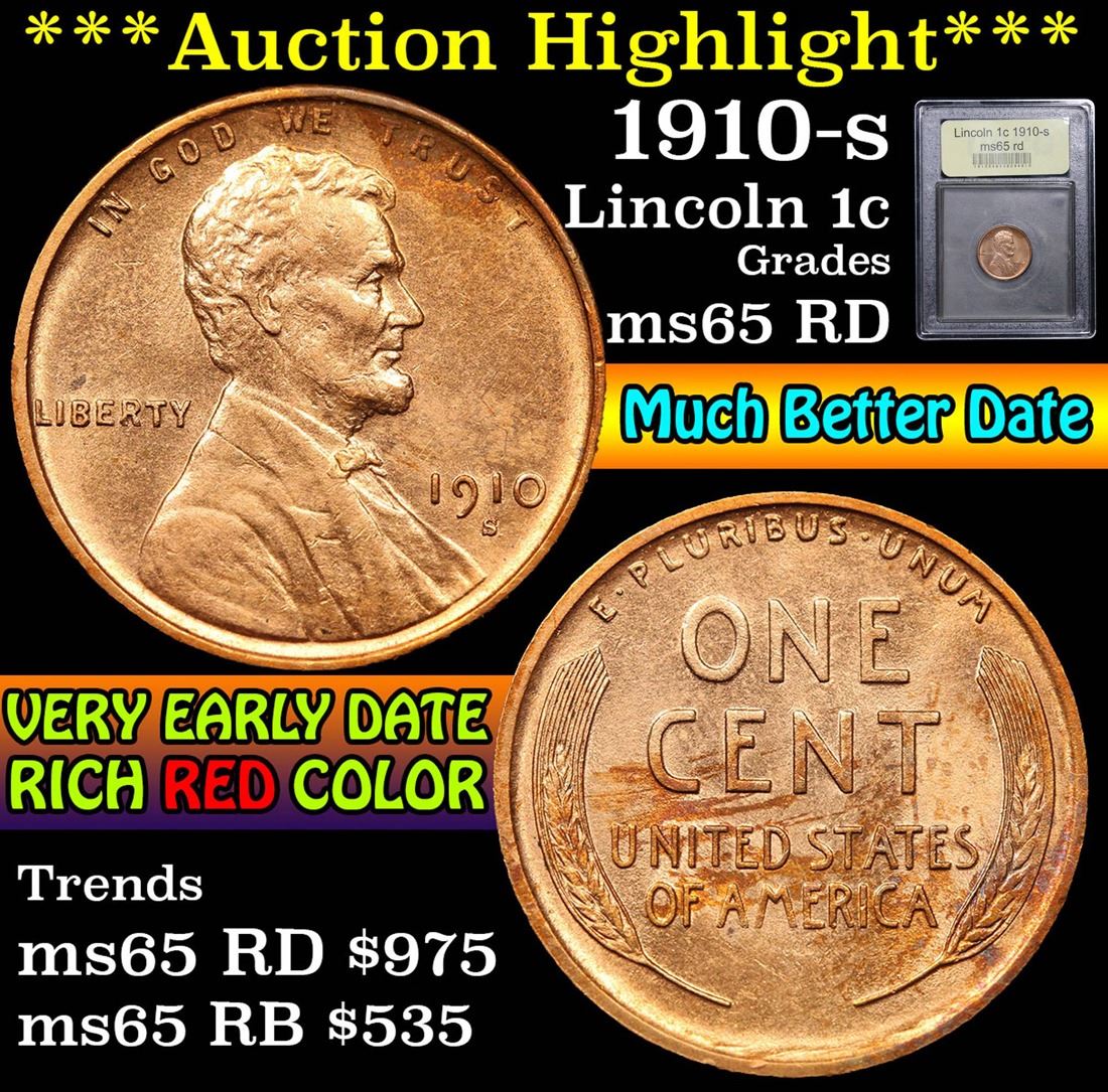 ***Auction Highlight*** 1910-s Lincoln Cent 1c Graded GEM Unc RD By USCG. Semi Key Date. Per David Hall of PCGS "The 1910-s has long been considered a semi-key date in circulated grades"