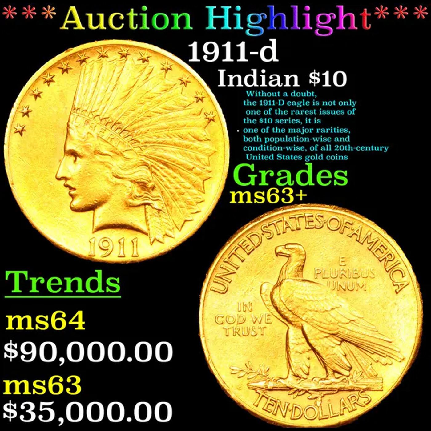 ***Auction Highlight*** 1911-d Gold Indian Eagle $10 Grades Select+ Unc. Without a doubt, the 1911-D eagle is not only one of the rarest issues of the $10 series, it is one of the major rarities, both population-wise and condition-wise, of all 20th-century United States gold coins as well. The 1911-D cannot be easily located in any Mint State grade, not even MS-60, and above the most basic Mint State level, the population dwindles to almost nothing A Key Date's Pick, Bid to Win, Don't let it get Away, you might not find its equal Coin. I give this coin my highest recommendation