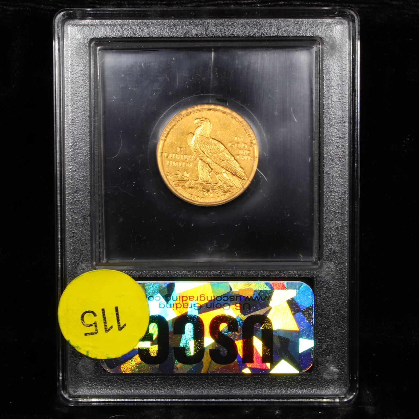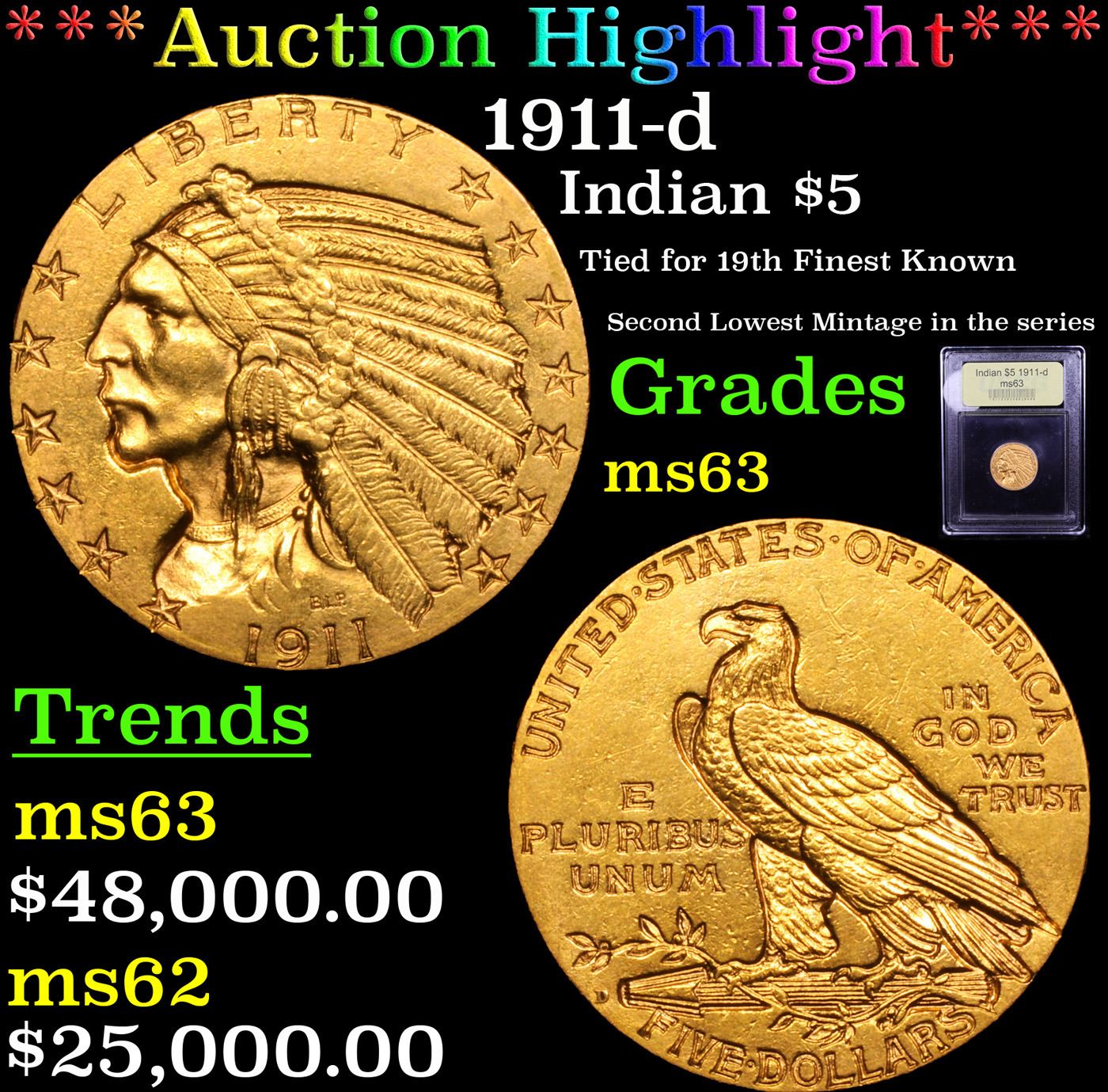 ***Auction Highlight*** 1911-d Gold Indian Half Eagle $5 Graded Select Unc By USCG. Offered is an exceptionally attractive Mint State example of a key date Indian half eagle issue. Bathed in deep honey-orange patina, both sides are lustrous with bold to sharp striking detail over all design elements. At the time the modest 72,500 half eagles struck at the Denver Mint were produced, numismatists were still beginning to appreciate mint marks. Many collectors, especially those who preferred more traditional avenues for collecting, mostly opted for Proof examples of a particular year. The 1911-D coins were largely ignored when they entered commercial channels, and unlike many of the other larger denomination gold coins at the time, this issue did not have extended sojourns in bags sitting in overseas banks. Rather, based on the number of circulated examples that survive to this day, a significant portion saw everyday use, and were further reduced in quantity by the large scale Treasury melts of the late 1930s. Second only to the 1909-O in terms of rarity and popularity in the Indian half eagle series, the 1911-D has long since gained appreciation as the key issue that it is. While moderately available at the higher circulated preservation levels, in Mint State the issue becomes a remarkable condition rarity, as well. At the assigned grade, it is difficult for us to imagine a more desirable example than the one offered here. Expect spirited bidding when it crosses the block. A strong bidding strategy is recommended. A Corey's Pick, Bid to Win, Don't let it get Away, you might not find its equal Coin. I give this coin my highest recommendation