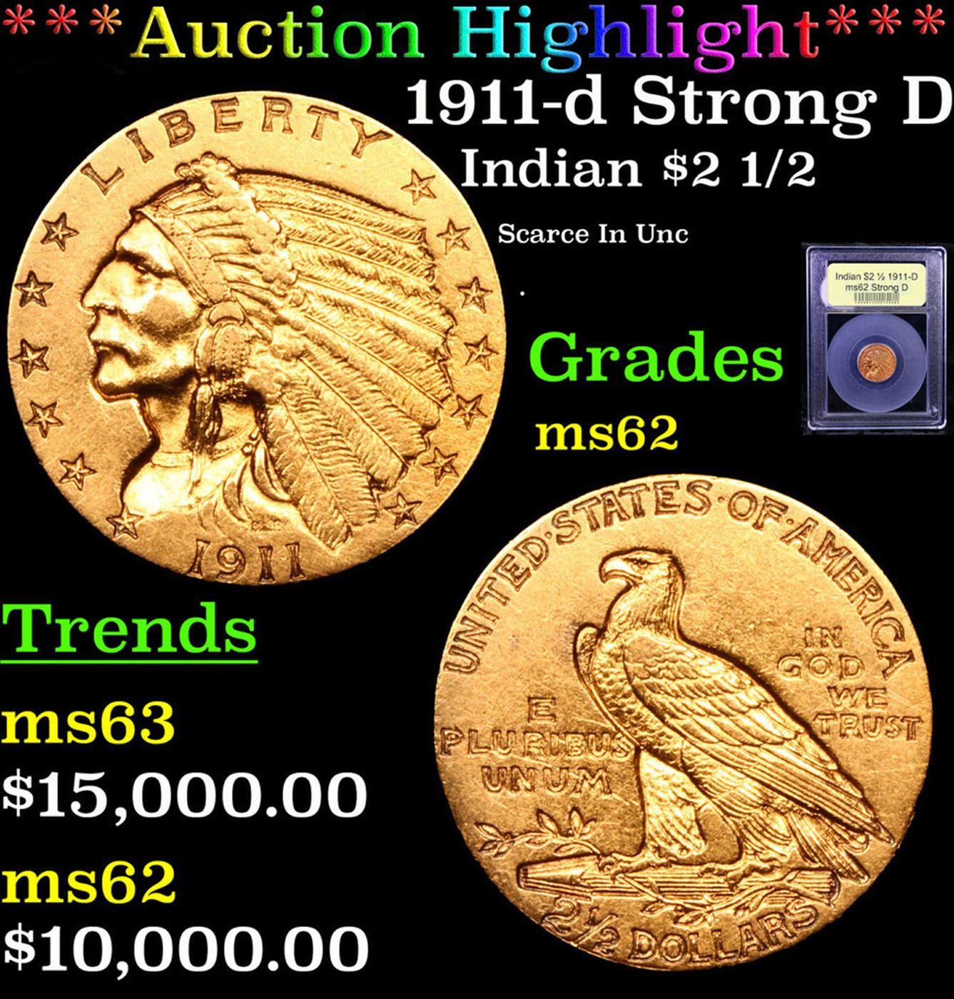 ***Auction Highlight*** 1911-d Strong D Gold Indian Quarter Eagle $2 1/2 Graded Select Unc By USCG. A Corey's Pick, Bid to Win, Don't let it get Away Coin