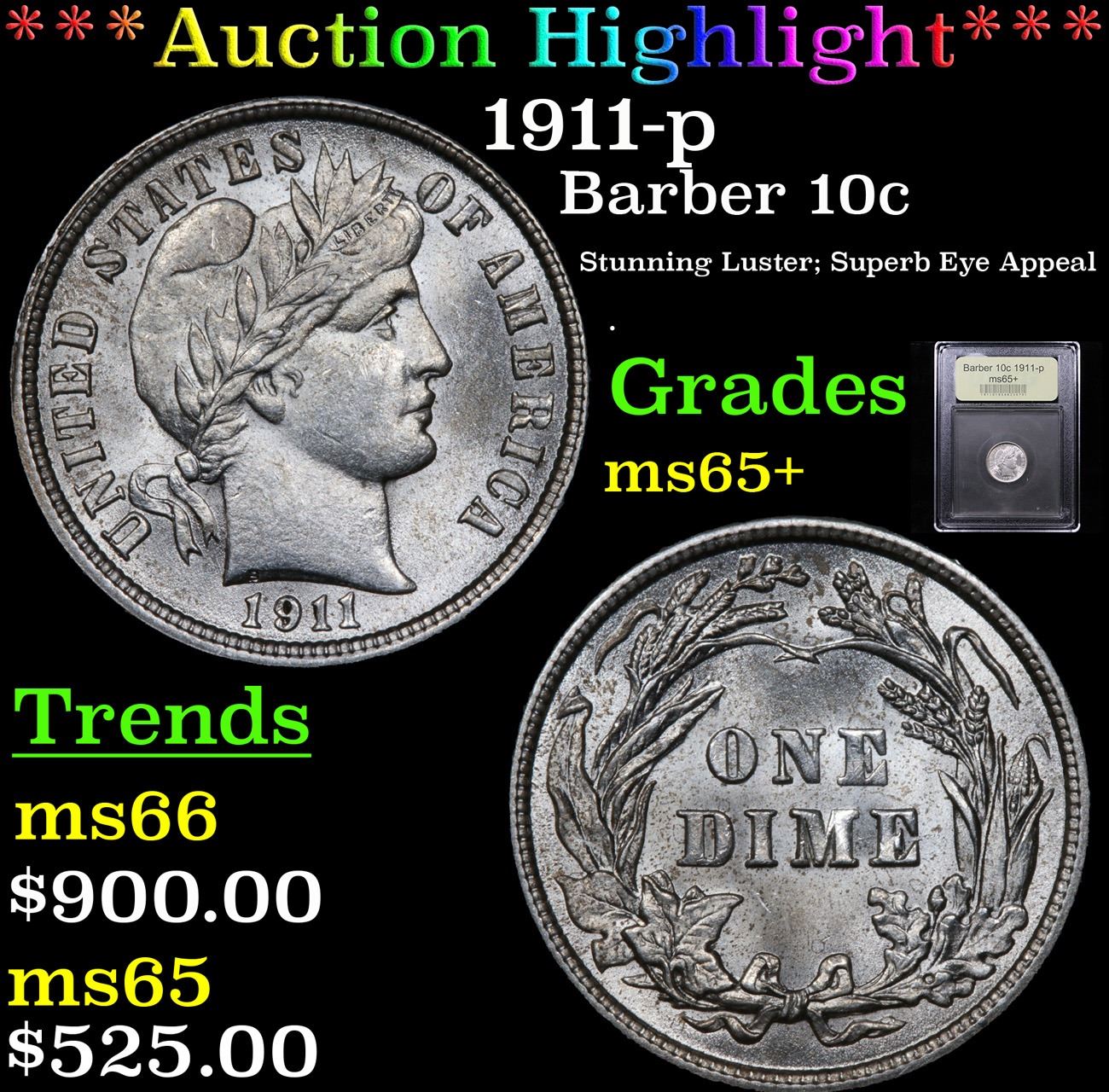 ***Auction Highlight*** 1911-p Stunning Luster; Superb Eye Appeal . Barber Dime 10c Graded GEM+ Unc By USCG. A Corey's Pick, Bid to Win Coin