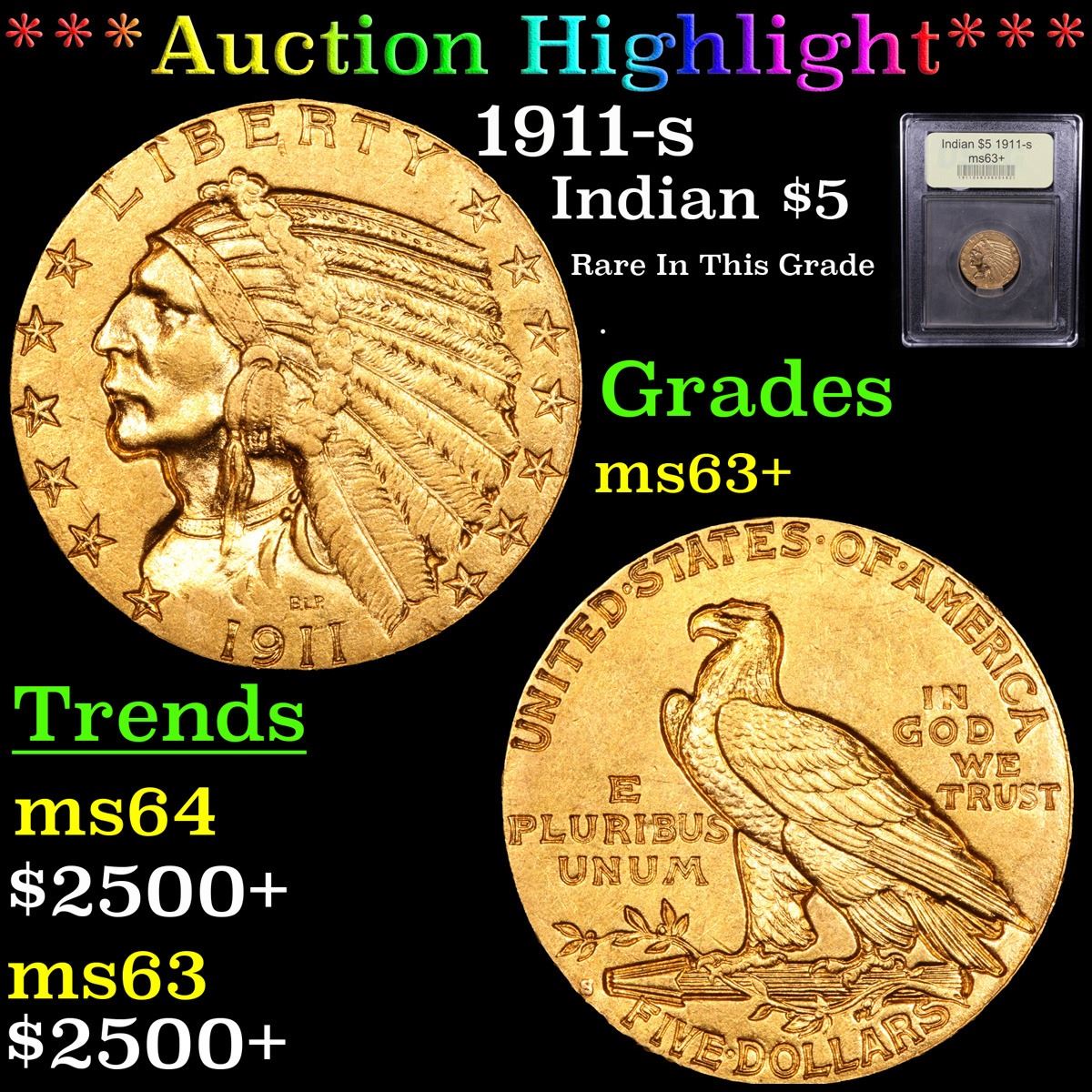 ***Auction Highlight*** 1911-s Rare In This Grade . Gold Indian Half Eagle $5 Graded Select+ Unc By USCG. A Corey's Pick, Bid to Win, Don't let it get Away Coin