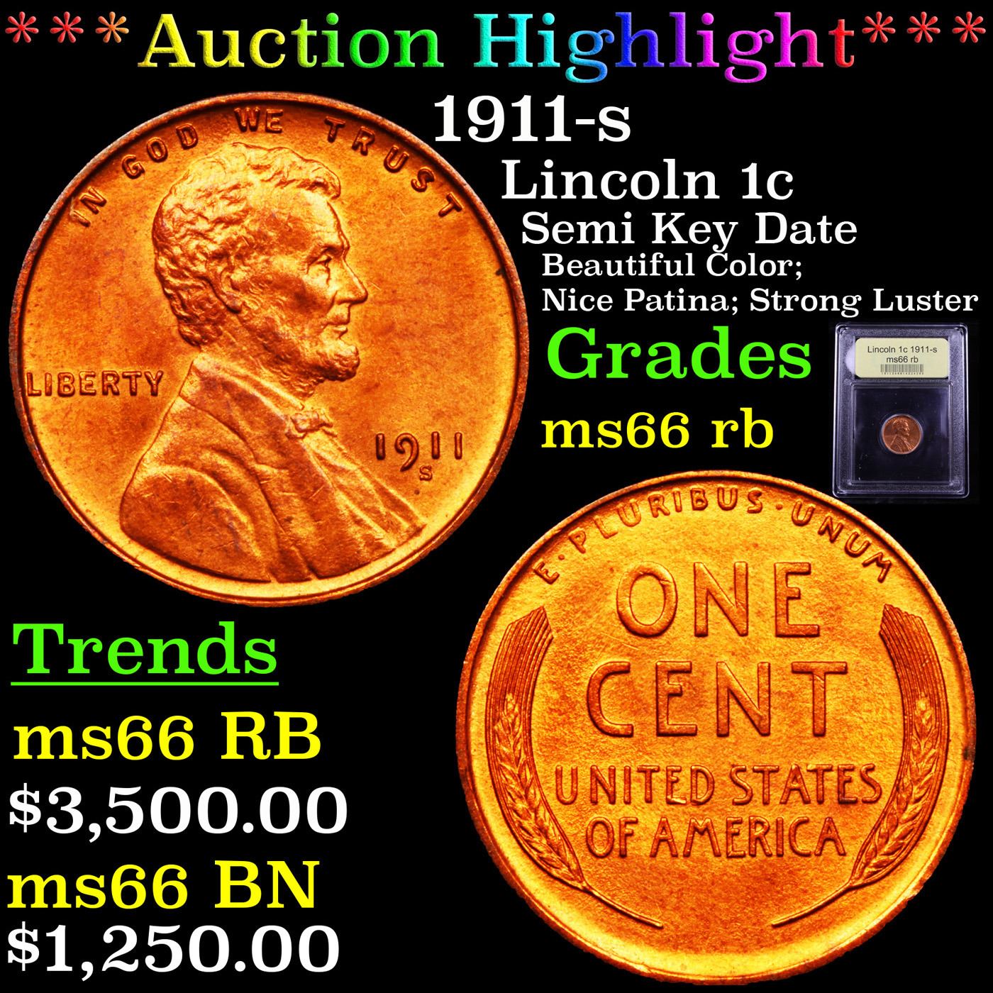 ***Auction Highlight*** 1911-s Lincoln Cent 1c Graded GEM+ Unc RB By USCG. Incredibly scarce date. PCGS estimates that out of an original mintage of over 4 million coins struck, only 900 remain in all grades. A Corey's Pick, Bid to Win, Don't let it get Away Coin