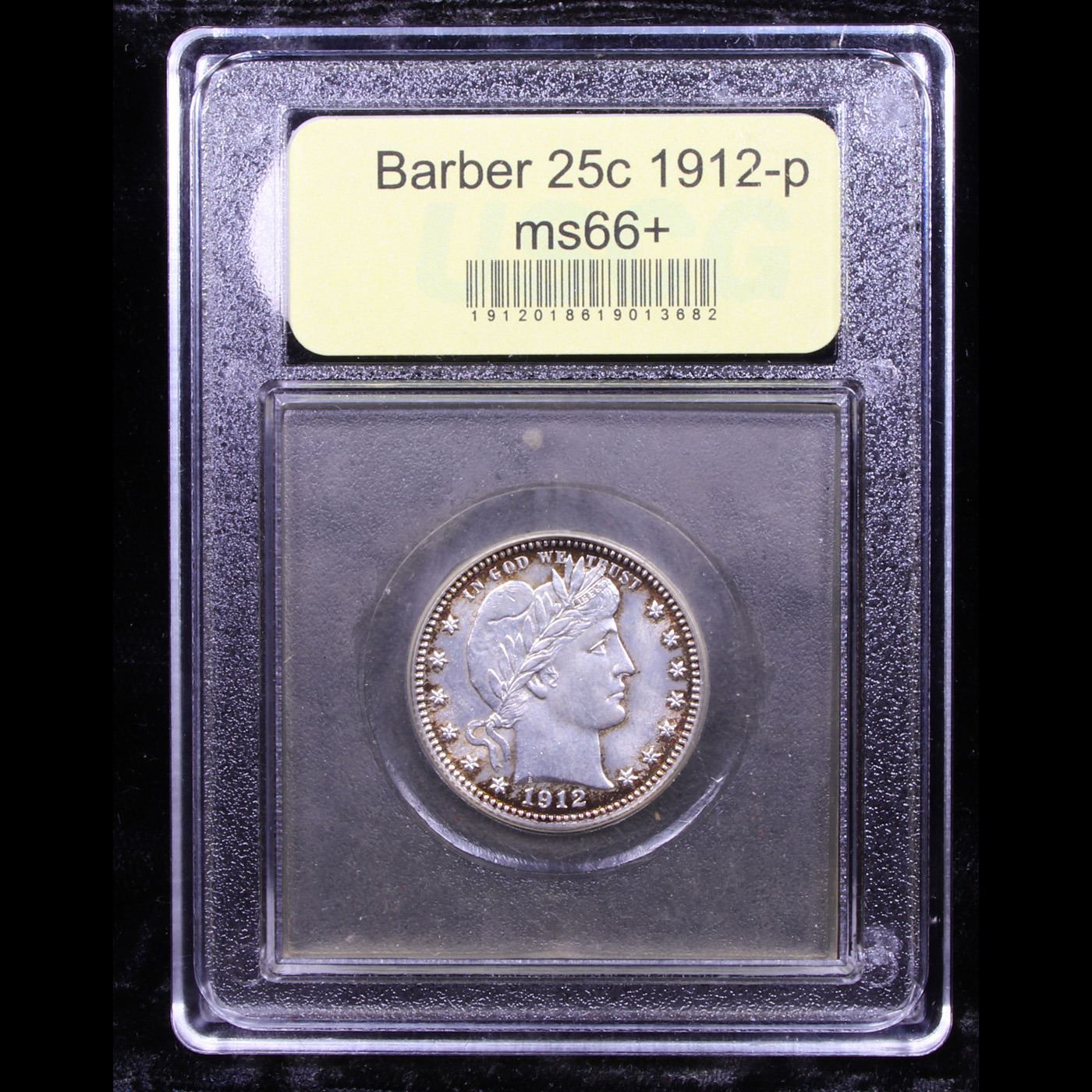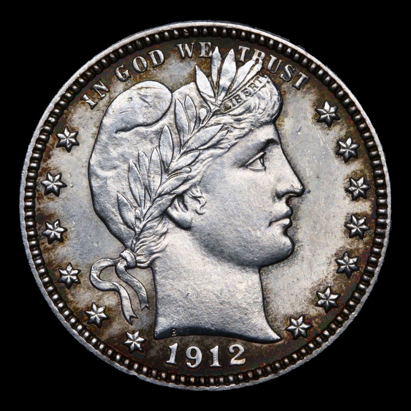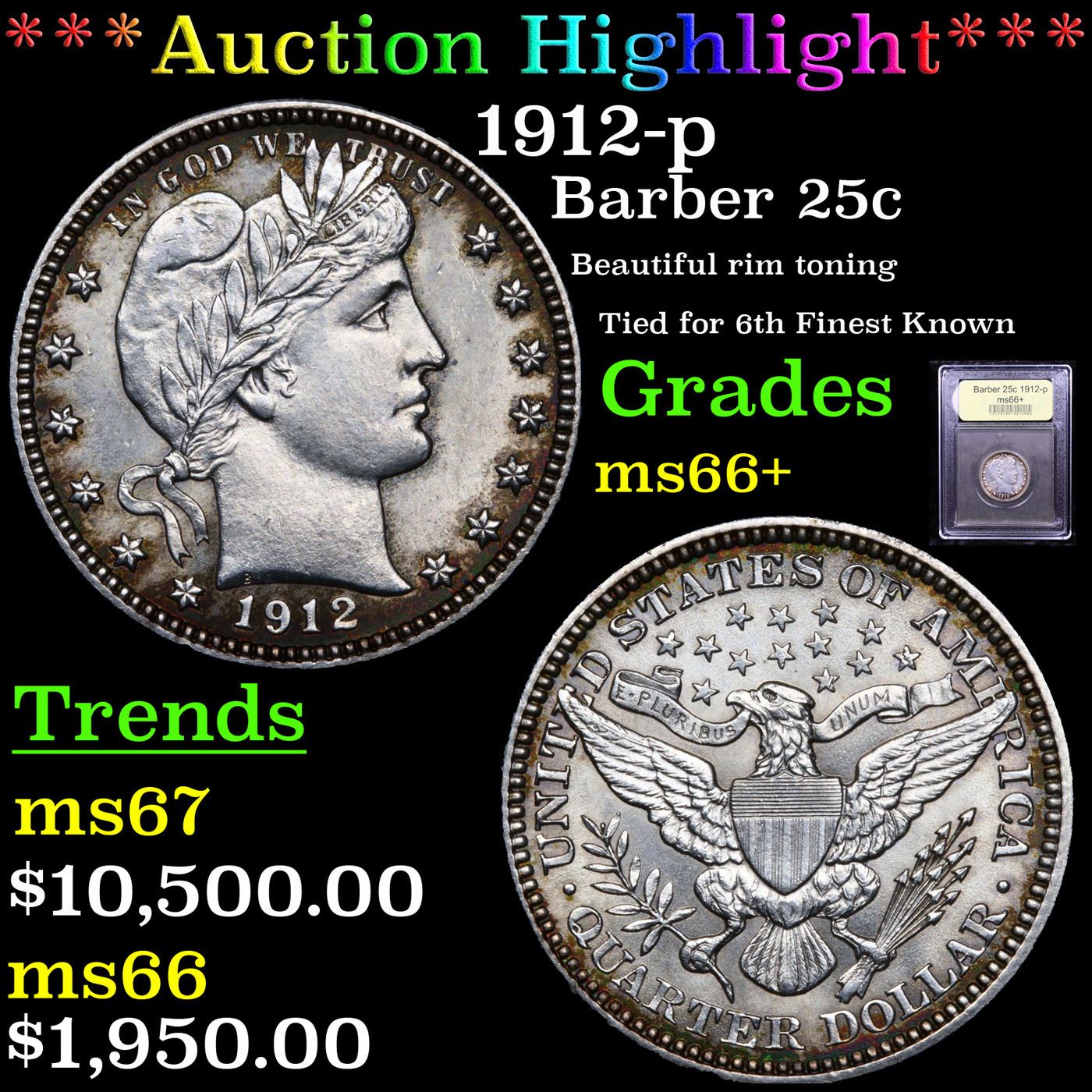 ***Auction Highlight*** 1912-p Barber Quarter 25c Graded GEM++ Unc By USCG. Rare in MS66 and prohibitively so any finer, the 1912 Barber quarter is an important condition rarity. Accents of rich plum-red and orange-gold toning adorn the borders, but the majority of this high-grade Barber type coin remains brilliant. The lustrous surfaces are splendidly smooth. The strike is sharp on the wingtips and shield corners, and shows only minor blending on the fletching A Corey's Pick, Bid to Win, Don't let it get Away Coin