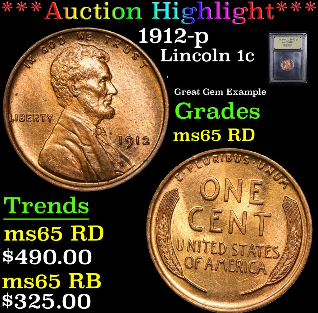 ***Auction Highlight*** 1912-p . Great Gem Example Lincoln Cent 1c Graded GEM Unc RD By USCG.         A Corey's Pick, Bid to Win Coin