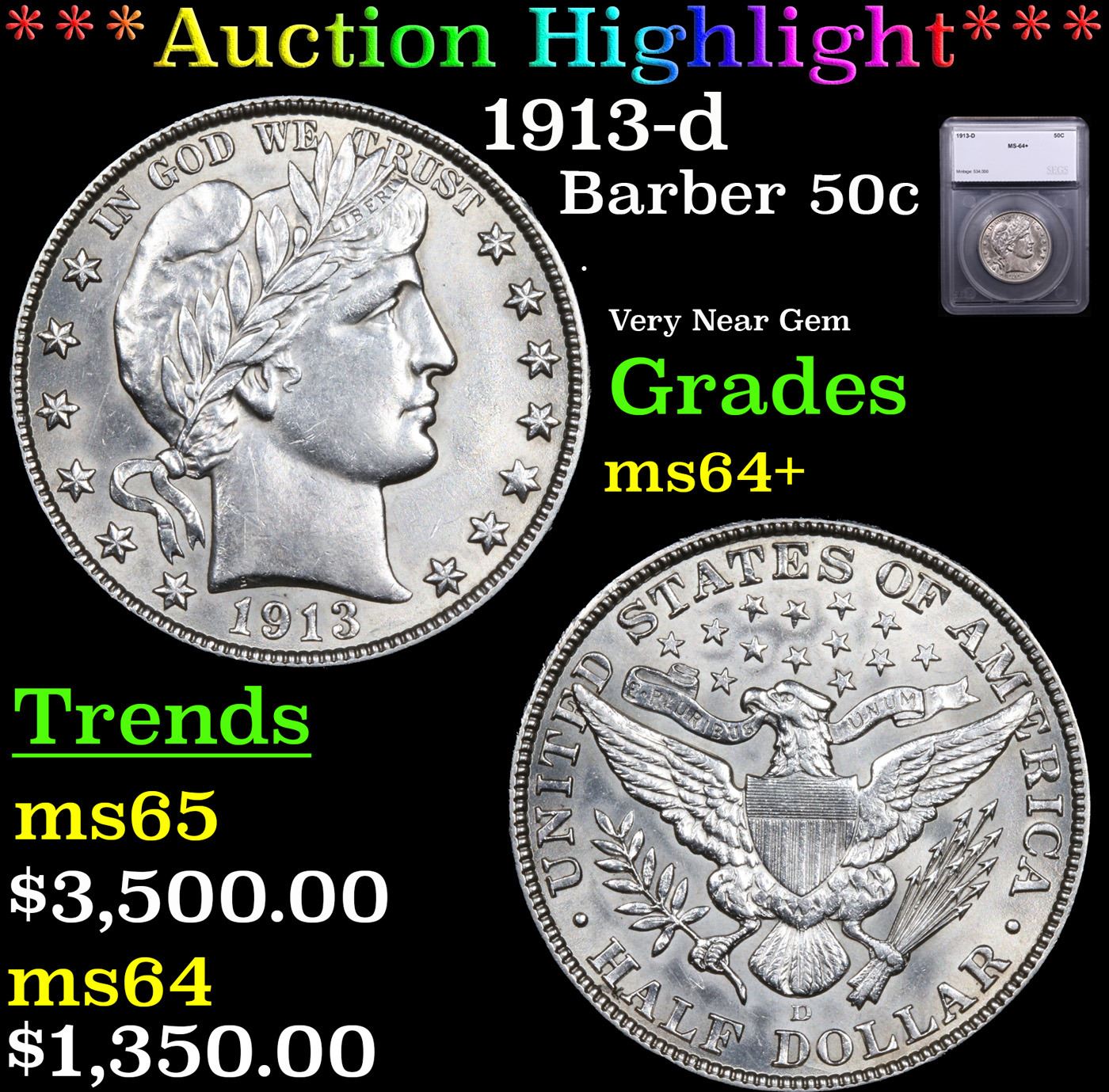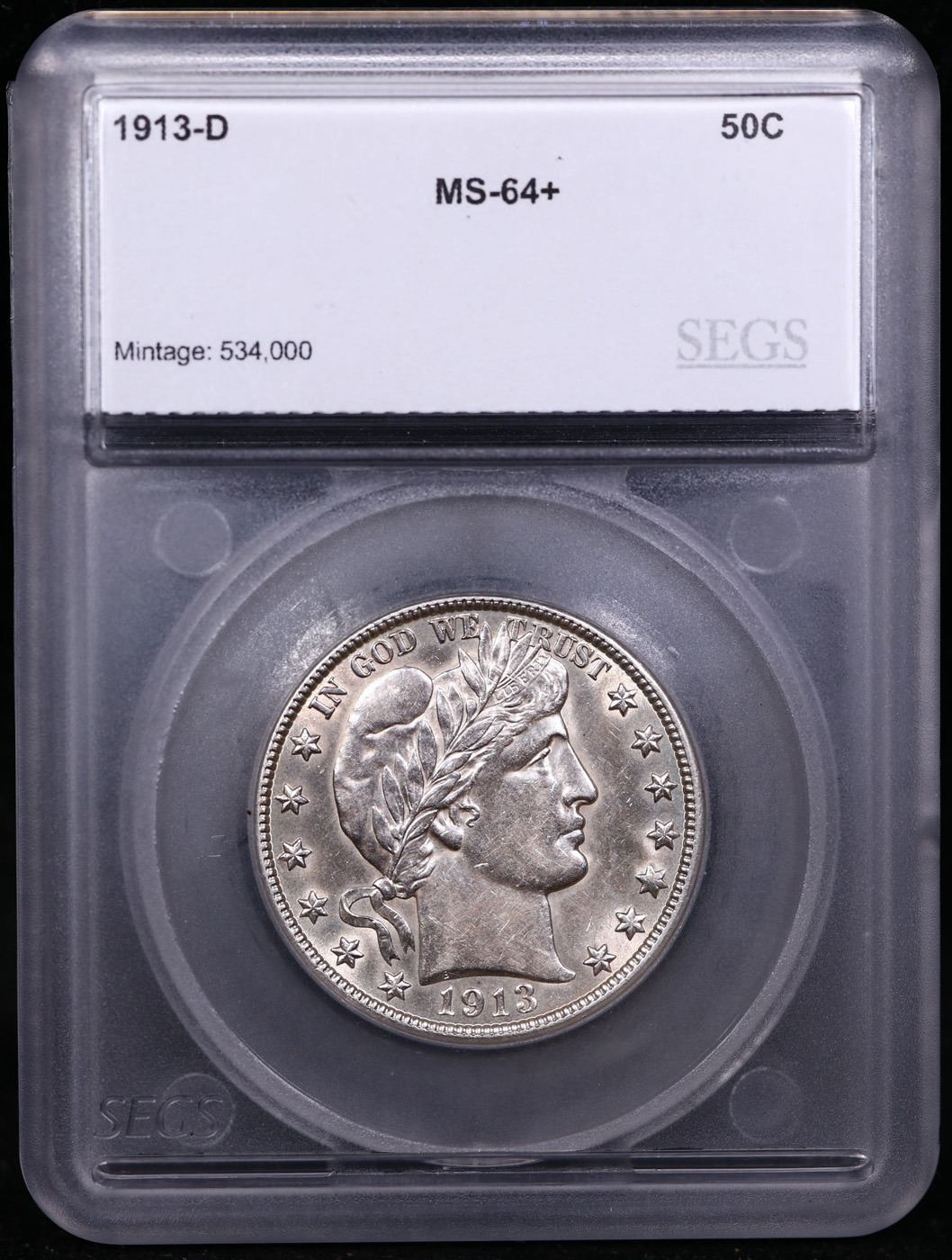 ***Auction Highlight*** 1913-d Barber Half Dollars 50c Graded ms64+ By SEGS. This is for the scarce 1913-d with a mintage of only 534,000.