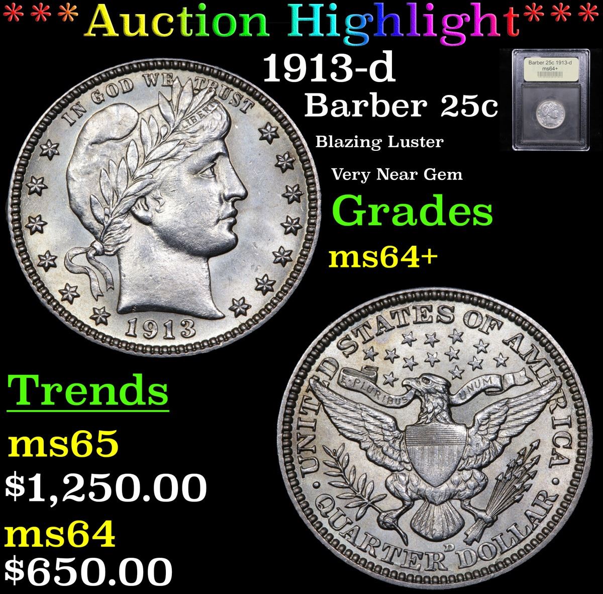 ***Auction Highlight*** 1913-d Blazing Luster Very Near Gem Barber Quarter 25c Graded Choice+ Unc By USCG. A Corey's Pick, Bid to Win Coin