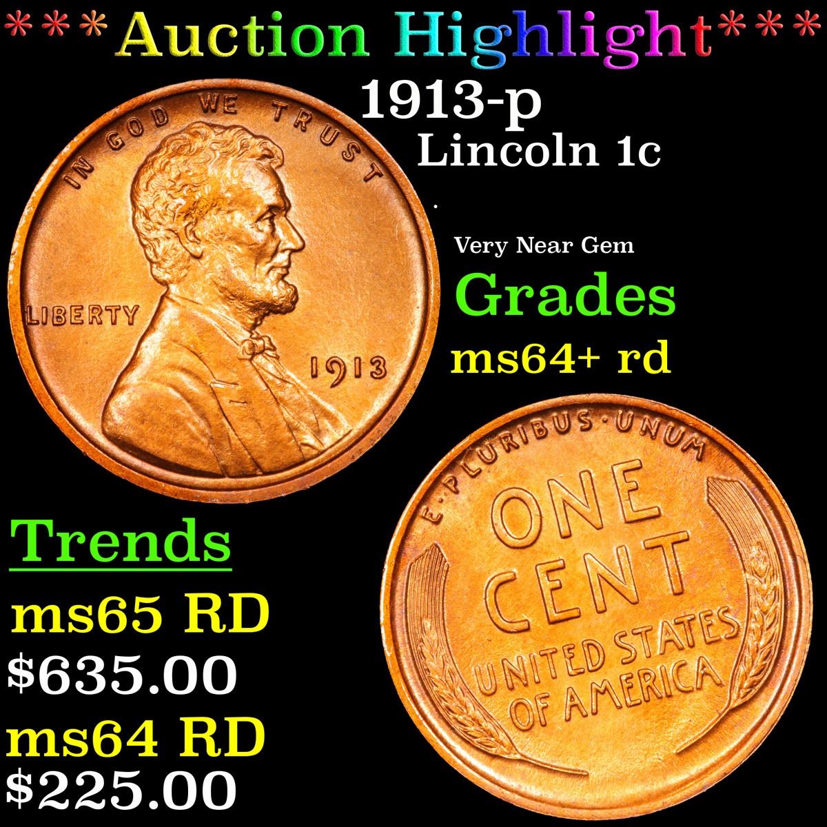 ***Auction Highlight*** 1913-p . Very Near Gem Lincoln Cent 1c Graded Choice+ Unc RD By USCG. A Corey's Pick, Bid to Win Coin
