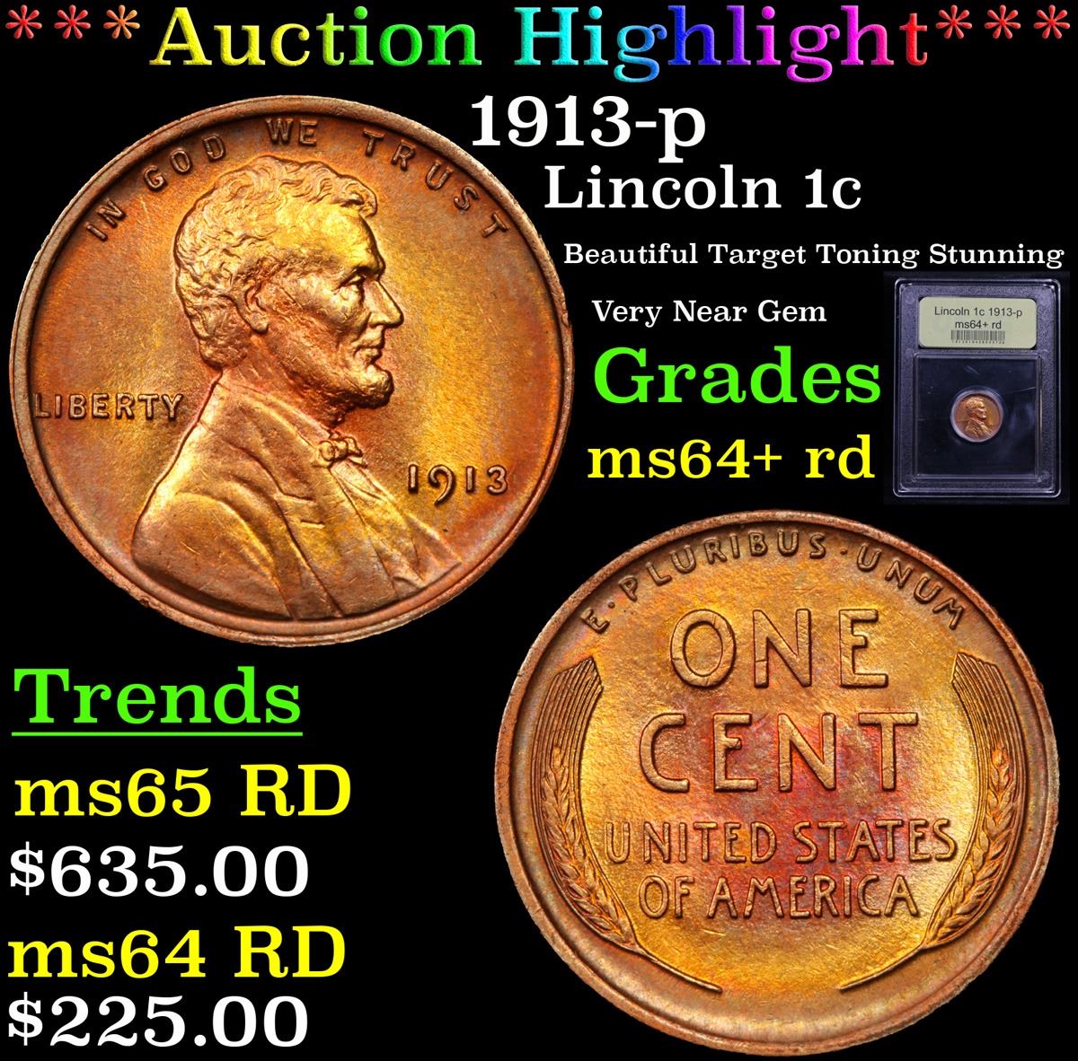 ***Auction Highlight*** 1913-p Lincoln Cent 1c Graded Choice+ Unc RD By USCG. A Corey's Pick, Bid to Win Coin