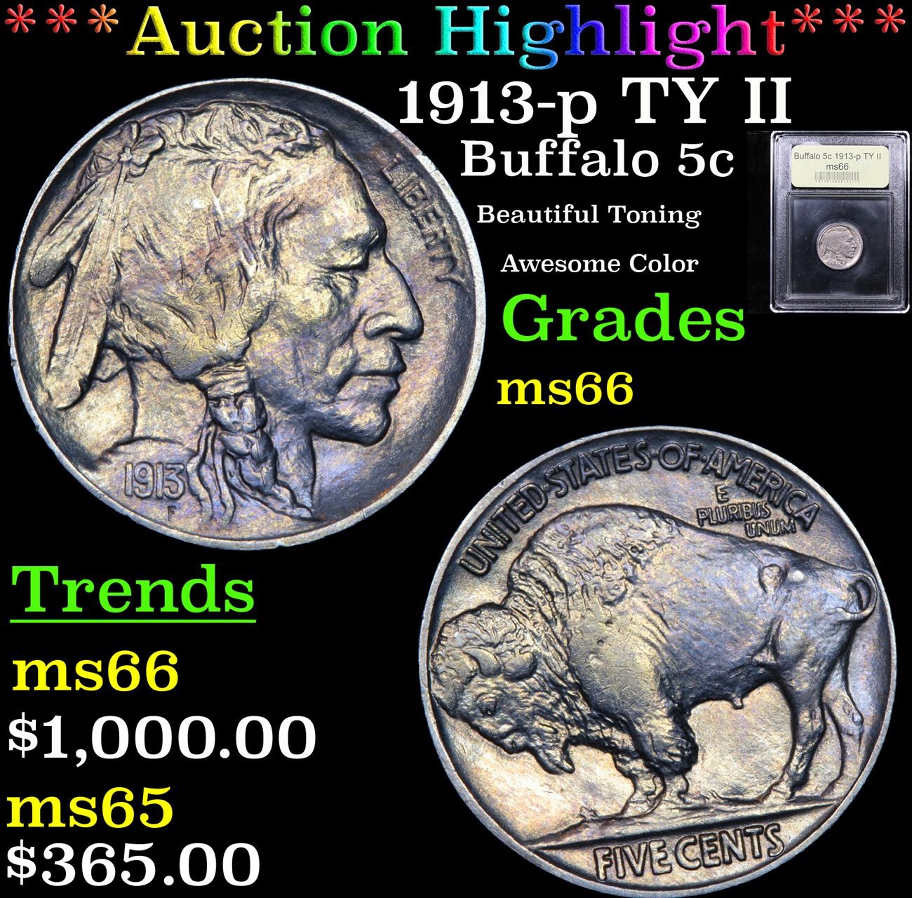 ***Auction Highlight*** 1913-p TY II Beautiful Toning Awesome Color Buffalo Nickel 5c Graded GEM+ Unc By USCG. A Corey's Pick, Bid to Win, Don't let it get Away, you might not find its equal Coin