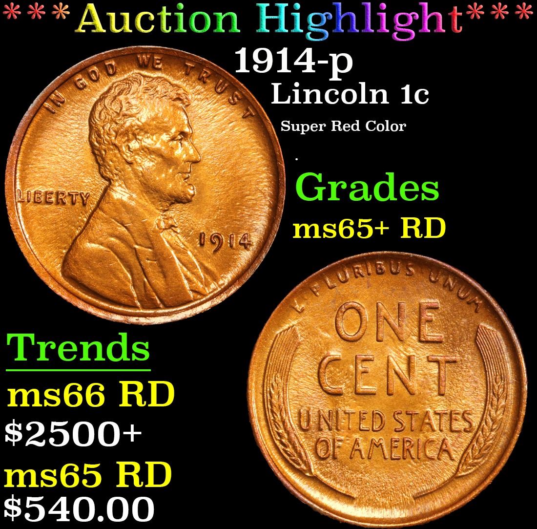 ***Auction Highlight*** 1914-p Lincoln Cent 1c Graded Gem+ Unc RD By USCG. Incredibly scarce date. Out of an original mintage of over 75 million coins struck, PCGS estimates only 600 remain in ms65 or better. Super Red Color A Corey's Pick, Bid to Win, Don't let it get Away Coin