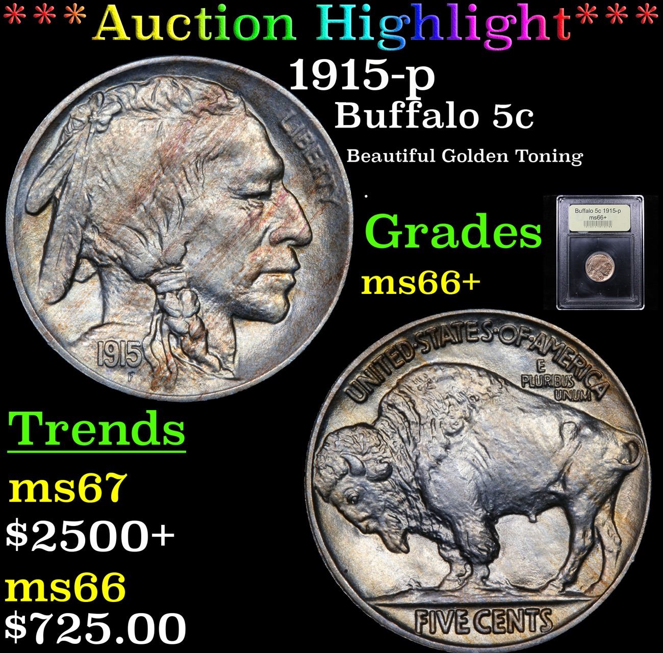 ***Auction Highlight*** 1915-p Beautiful Golden Toning . Buffalo Nickel 5c Graded GEM++ Unc By USCG. A Corey's Pick, Bid to Win Coin
