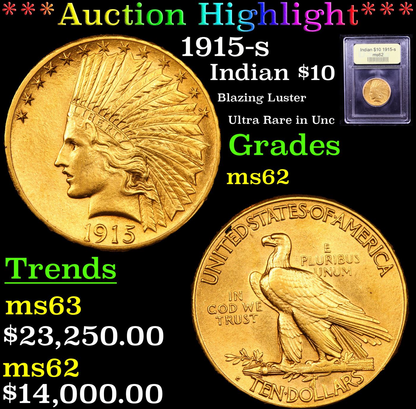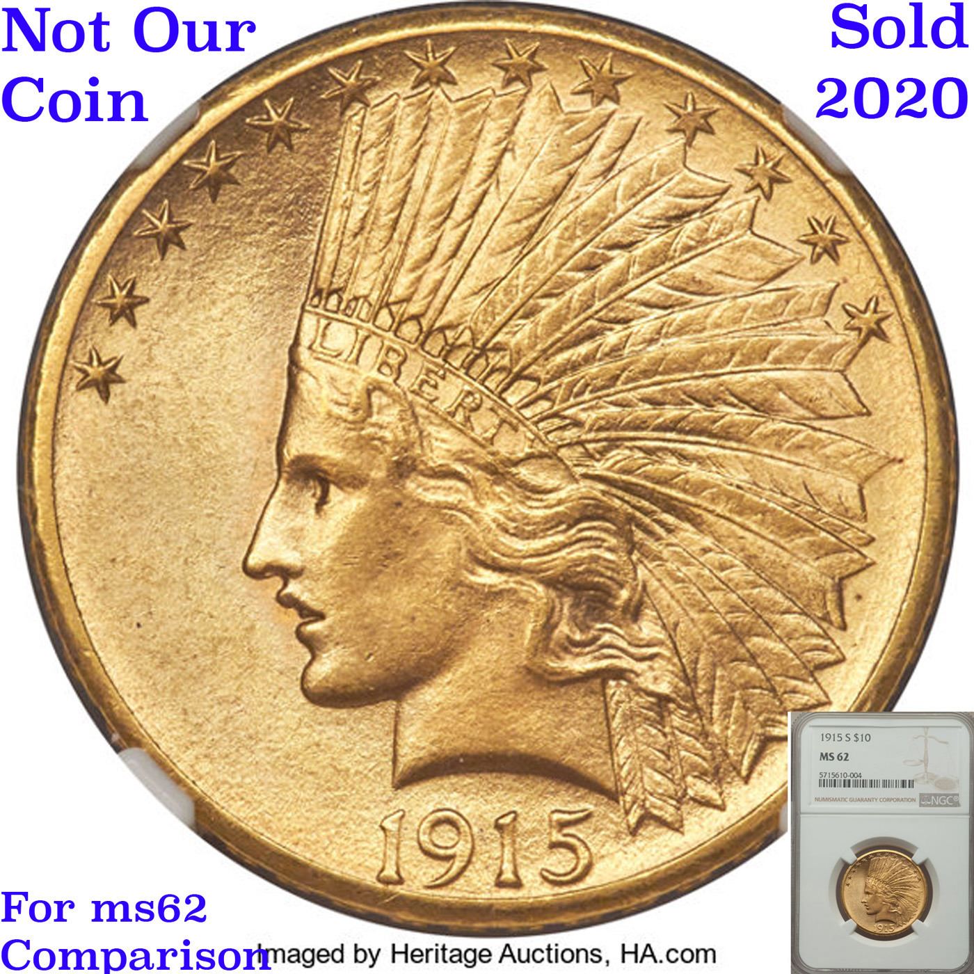***Auction Highlight*** 1915-s Gold Indian Eagle $10 Graded Select Unc BY USCG. Only 55,000 Indian eagles were struck at the San Francisco Mint in 1915, as commercial demand for gold coins diminished with the start of World War I. This impressive MS62 example displays well-detailed design elements throughout and the minimally marked yellow-gold surfaces radiate vibrant mint luster from both sides. I have included two other ms62 examples for your comparison. I think ours compares quite favorably with both. A Corey's Pick, Bid to Win, Don't let it get Away, you might not find its equal Coin. I give this coin my highest recommendation