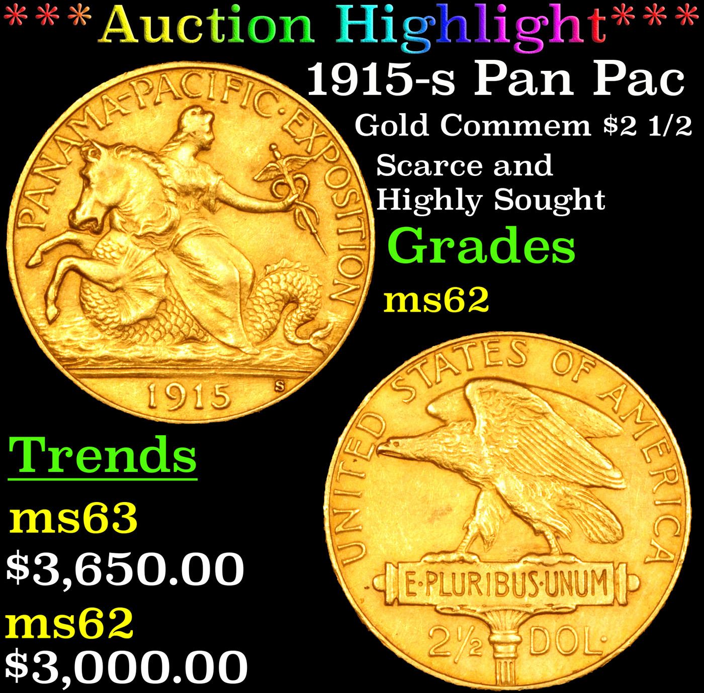 ***Auction Highlight*** 1915-s Pan Pac Gold Commem $2 1/2 Grades Select Unc. Up for Auction is a great survivor from this coveted issue, displaying lemon-yellow coloration and uniform satiny luster. The Congressional Act of January 16, 1915, called for the production of special half dollars, gold dollars, quarter eagles and $50 gold pieces to commemorative the historic Panama-Pacific Exposition. The Act specified the maximum number of examples of each denomination to be struck, including 10,000 pieces for the quarter eagle. Due to its proximity to the Expo, the San Francisco Mint produced all of the commemoratives, including the authorized 10,000 quarter eagles, plus an additional 17 coins for assay purposes. Sales to the public both at the Exposition and through other venues proved somewhat disappointing, however, and in due course 3,251 examples were returned to the Mint and melted, leaving a net distribution of just 6,749 pieces. A Corey's Pick, Bid to Win Coin