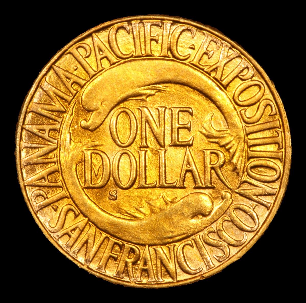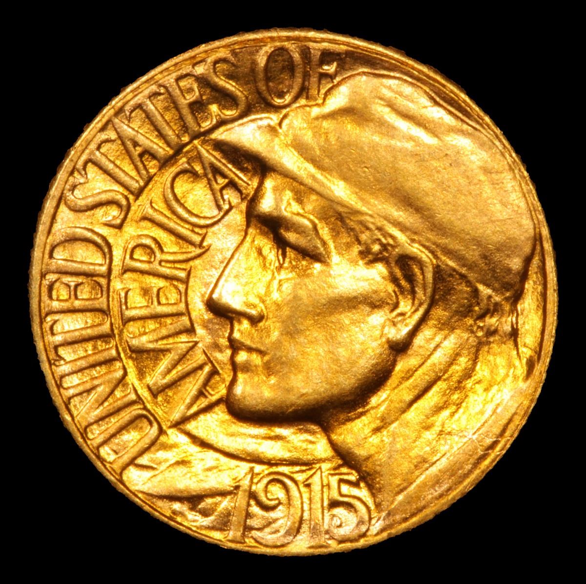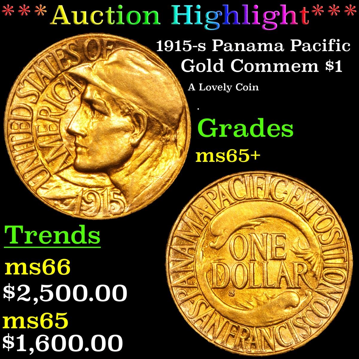 ***Auction Highlight*** 1915-s Panama Pacific Gold Commem Dollar 1 Grades GEM+ Unc. This frosty rose-gold example has smartly impressed design elements and surfaces that are as nice as would be expected at the assigned grade. Lovely! Scare and Sought After Commemorative. This Coin as well as 4 others were All Struck to Celebrate the Completion of the Panama Canal, and Released at the World's Fair in San Francisco Marking the Celebration. When Examining a 1915-s Pan Pac points to Check for wear are the Peak of the Laborer’s Cap and the Heads of the Dolphins. A Corey's Pick, Bid to Win Coin