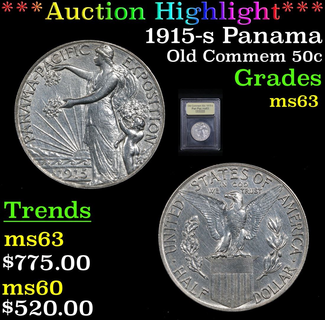 ***Auction Highlight*** 1915-s Panama Pacific . . Old Commem 50c 50c Graded Select Unc By USCG. Exceptionally Rare Commemorative. The Pan Pac was Minted Along with 4 Other Coins to Commemorate the Completion of the Panama Canal and Distributed at the Panama Pacific Exposition in San Francisco which also Celebrated the Renewal of San Francisco since the Great Fire. When Examining the Pan Pac Half Dollar, Note that there is a Problem with Pan-Pac Halves in its Strike: Weakness is often Evident on Columbia’s Head, Cap, Arm and Body, also on the Eagle's Breast Feathers and Claws. Occasionally, Coins are seen with a Rim Indentation Near the Periphery on Each Side; this is a Mint Caused Problem and Should Not Be Factored Into the Grade. When Grading Lightly Circulated Examples, Friction is First Evident on Columbia's Shoulder and on the Eagle's Breast.
