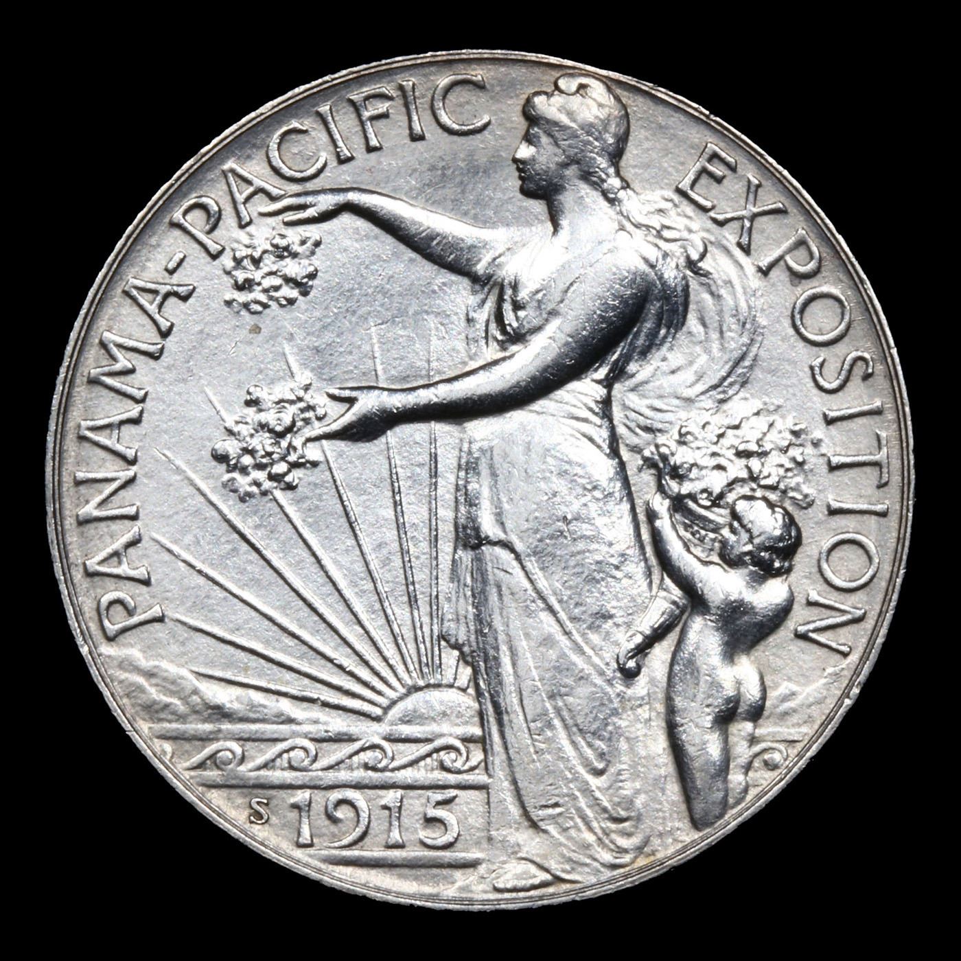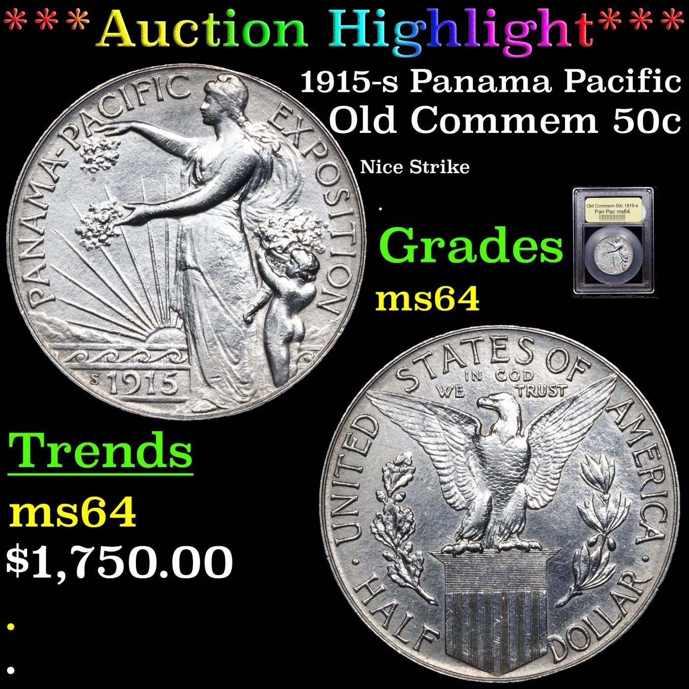 ***Auction Highlight*** 1915-s Panama Pacific Old Commem Half Dollar 50c Graded Choice Unc BY USCG. The 1915 Panama Pacific Half Dollar represented only the second commemorative silver half dollar issued by the United States Mint. Although this would later become the most frequent denomination for classic commemorative coins, the earlier issues took place across a range of denominations. The program of five commemorative coins issued for the Panama Pacific International Exposition included two versions of a $50 gold piece, a gold quarter eagle, and a gold dollar.The half dollar featured the full length figure of the allegorical Columbia with rays of the sun and the Golden Gate in the background. Her arms are outstretched to scatter fruits and flowers. A cherub appears to her right holding a cornucopia. The obverse includes the “S” mint mark, as the coins were produced at the San Francisco Mint facility.The reverse of the Panama Pacific Exposition Half Dollar features an American Eagle with wings outstretched, perched on a shield. An oak branch and olive branch appears to each side to represent strength and peace. The words “In God We Trust” appear near the eagle’s head, representing the motto’s first appearance on a commemorative coin. The obverse of the coin was designed by Charles E. Barber, and the reverse was designed by George T. Morgan.When Examining the Pan Pac Half Dollar, Note that there is a Problem with Pan-Pac Halves in its Strike: Weakness is often Evident on Columbia’s Head, Cap, Arm and Body, also on the Eagle's Breast Feathers and Claws. Occasionally, Coins are seen with a Rim Indentation Near the Periphery on Each Side; this is a Mint Caused Problem and Should Not Be Factored Into the Grade. When Grading Lightly Circulated Examples, Friction is First Evident on Columbia's Shoulder and on the Eagle's Breast.