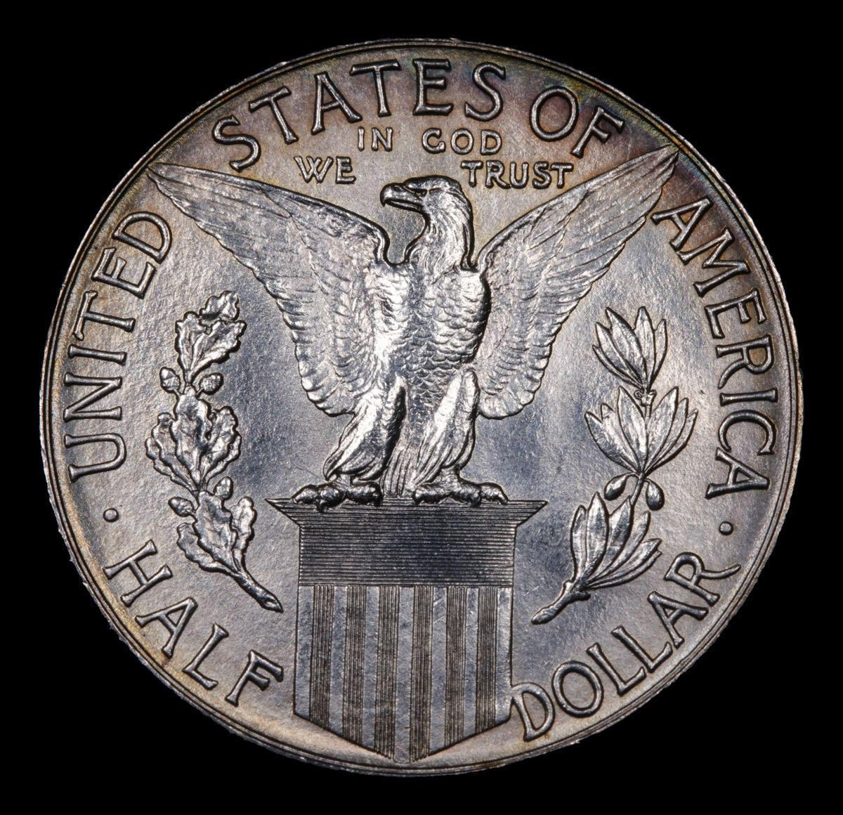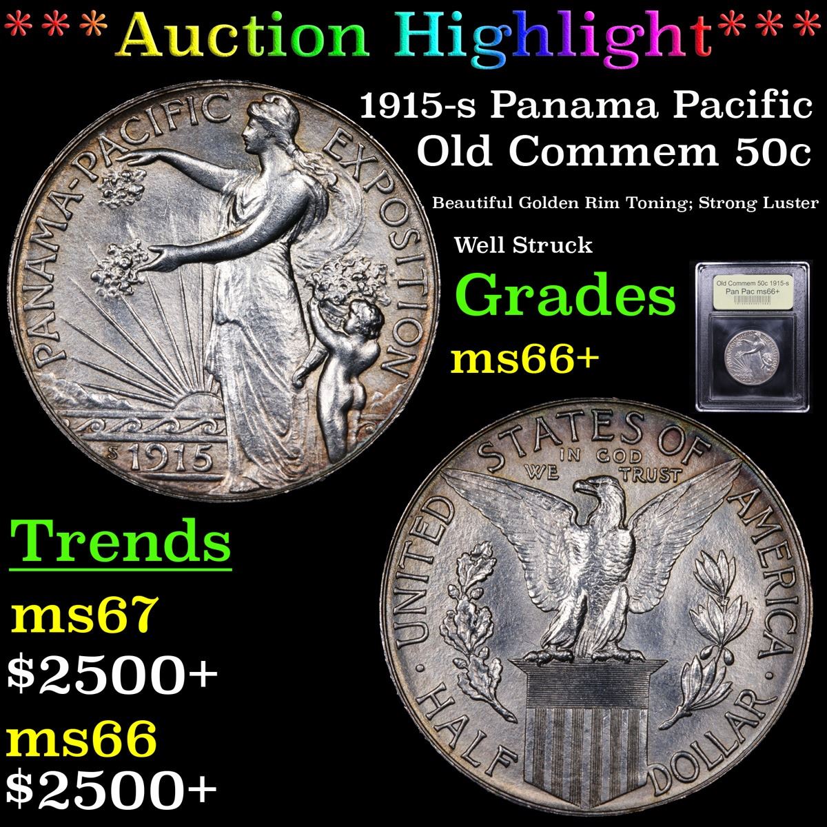***Auction Highlight*** 1915-s Panama Pacific Old Commem Half Dollar 50c Graded GEM++ Unc By USCG. Exceptionally Rare Commemorative. The Pan Pac was Minted Along with 4 Other Coins to Commemorate the Completion of the Panama Canal and Distributed at the Panama Pacific Exposition in San Francisco which also Celebrated the Renewal of San Francisco since the Great Fire. When Examining the Pan Pac Half Dollar, Note that there is a Problem with Pan-Pac Halves in its Strike: Weakness is often Evident on Columbia’s Head, Cap, Arm and Body, also on the Eagle's Breast Feathers and Claws. Occasionally, Coins are seen with a Rim Indentation Near the Periphery on Each Side; this is a Mint Caused Problem and Should Not Be Factored Into the Grade. When Grading Lightly Circulated Examples, Friction is First Evident on Columbia's Shoulder and on the Eagle's Breast. This is a wonderfully original example of a key date classic commemorative type. Both sides are Beautifully Rim toned in olive-gold, with antique silver in the centers. The surfaces are smooth, satiny and extremely attractive.