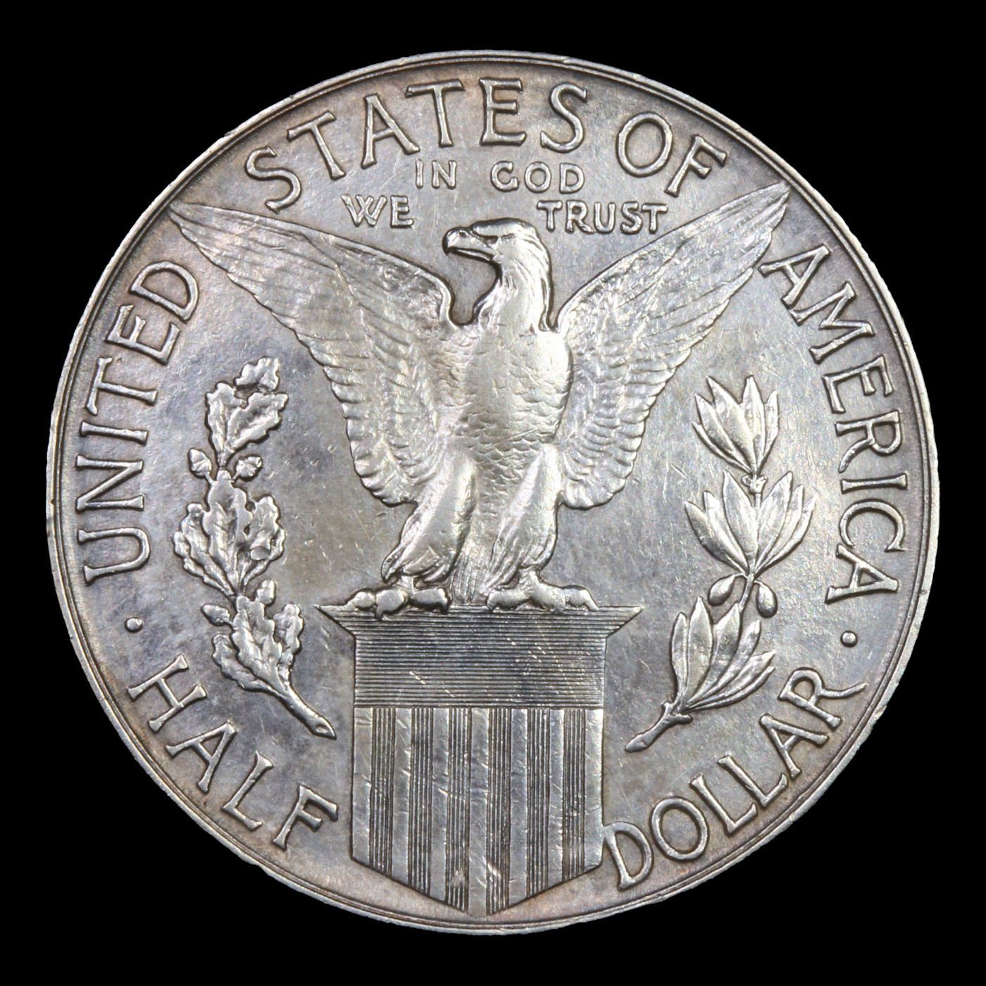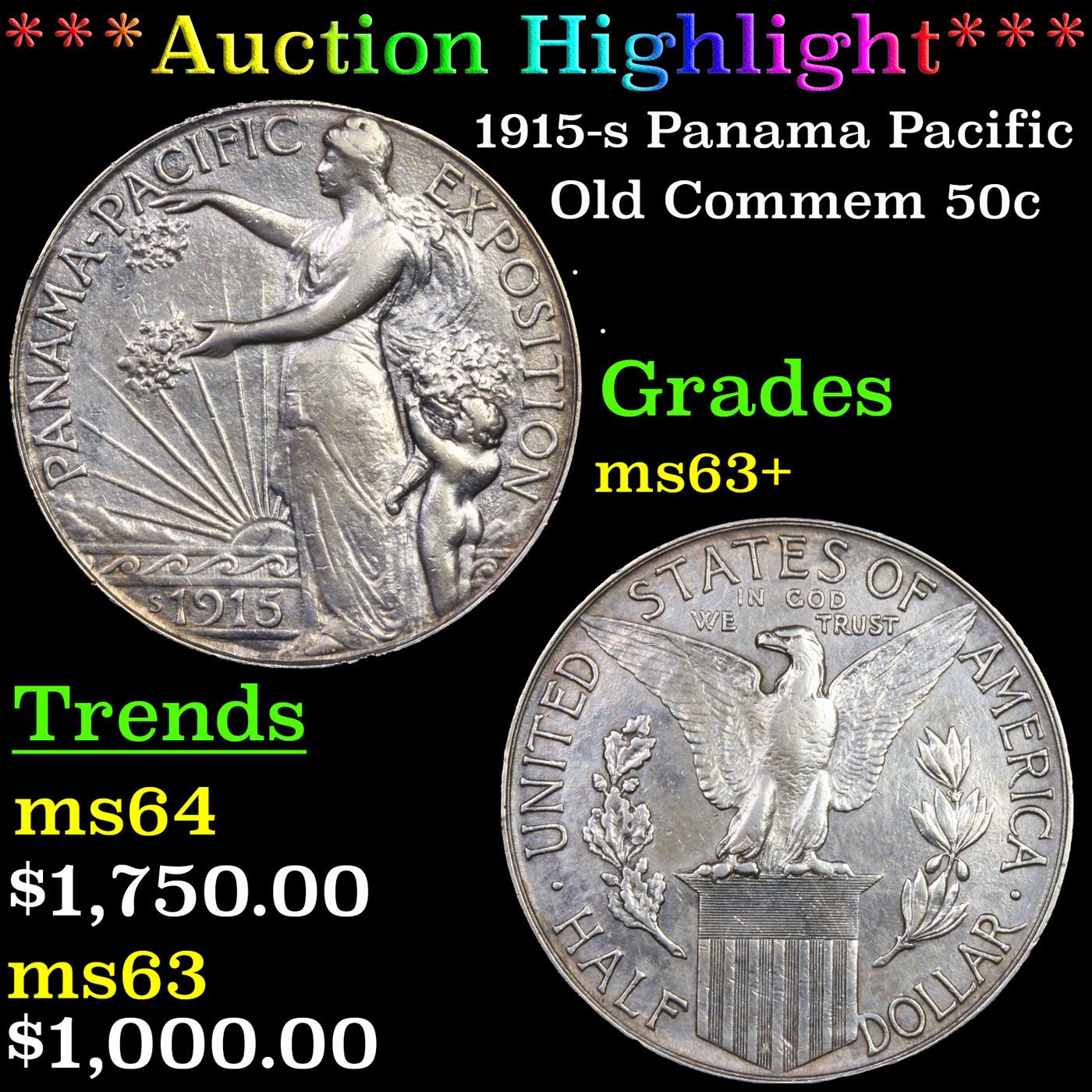 ***Auction Highlight*** 1915-s Panama Pacific Old Commem Half Dollar 50c Graded Select+ Unc BY USCG. The 1915 Panama Pacific Half Dollar represented only the second commemorative silver half dollar issued by the United States Mint. Although this would later become the most frequent denomination for classic commemorative coins, the earlier issues took place across a range of denominations. The program of five commemorative coins issued for the Panama Pacific International Exposition included two versions of a $50 gold piece, a gold quarter eagle, and a gold dollar.The half dollar featured the full length figure of the allegorical Columbia with rays of the sun and the Golden Gate in the background. Her arms are outstretched to scatter fruits and flowers. A cherub appears to her right holding a cornucopia. The obverse includes the “S” mint mark, as the coins were produced at the San Francisco Mint facility.The reverse of the Panama Pacific Exposition Half Dollar features an American Eagle with wings outstretched, perched on a shield. An oak branch and olive branch appears to each side to represent strength and peace. The words “In God We Trust” appear near the eagle’s head, representing the motto’s first appearance on a commemorative coin. The obverse of the coin was designed by Charles E. Barber, and the reverse was designed by George T. Morgan.When Examining the Pan Pac Half Dollar, Note that there is a Problem with Pan-Pac Halves in its Strike: Weakness is often Evident on Columbia’s Head, Cap, Arm and Body, also on the Eagle's Breast Feathers and Claws. Occasionally, Coins are seen with a Rim Indentation Near the Periphery on Each Side; this is a Mint Caused Problem and Should Not Be Factored Into the Grade. When Grading Lightly Circulated Examples, Friction is First Evident on Columbia's Shoulder and on the Eagle's Breast.